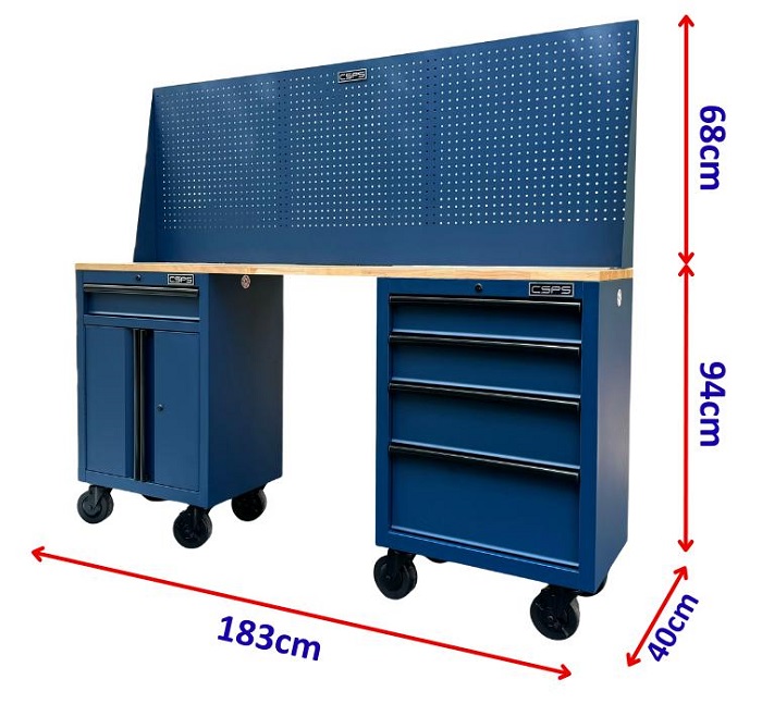 CSPS 183cm Workbench with Wooden Worktop and Pegboard and Casters– 5 Blue Drawers