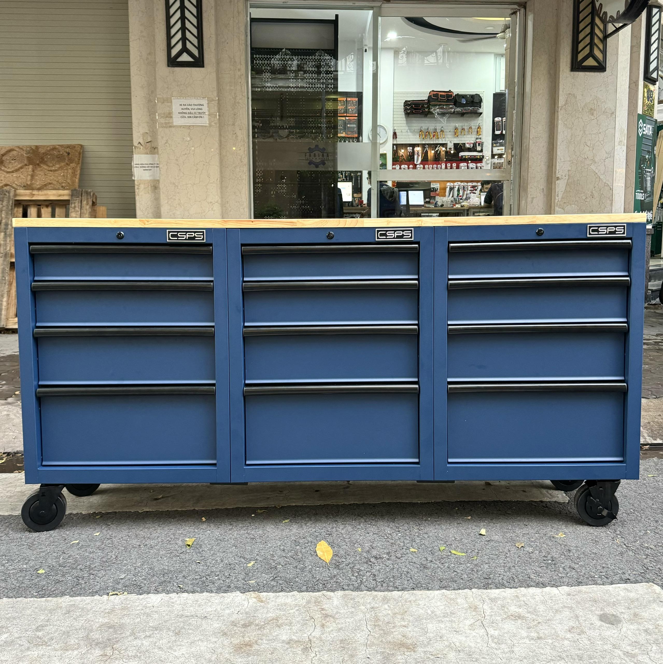 Set of 3 CSPS 183cm blue tool cabinets with wooden top - 12 drawers