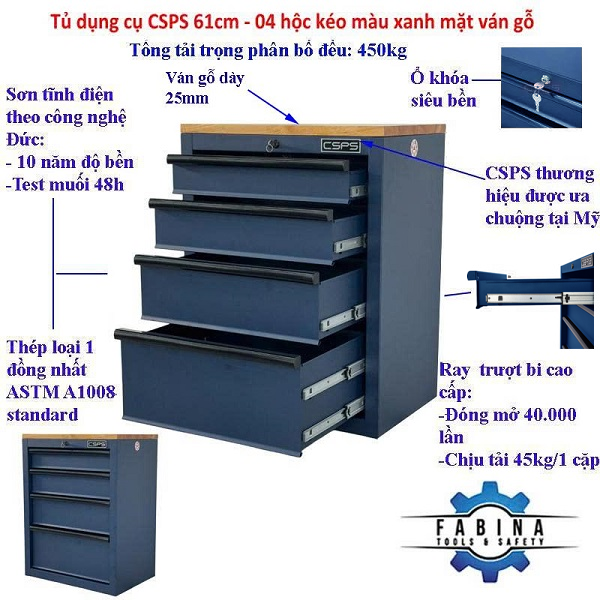 CSPS Blue Tool Cabinet 61cm with Wooden Top – 04 Drawers