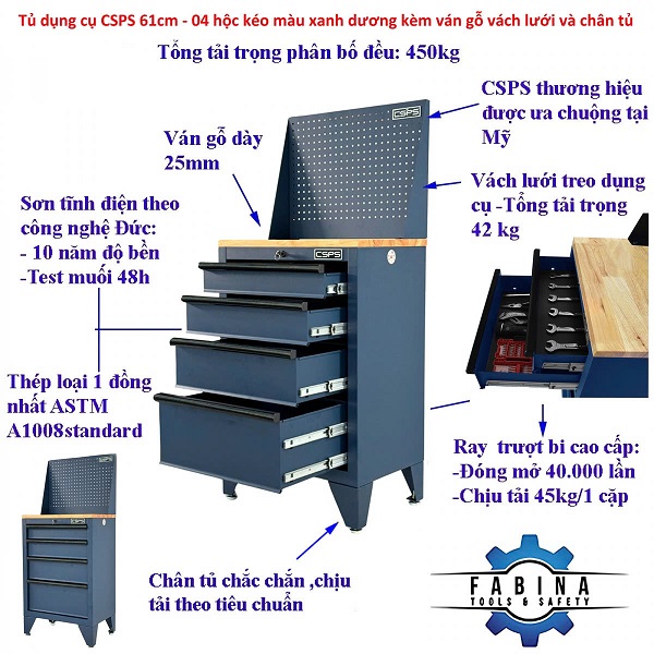 CSPS Blue Tool Cabinet 61cm including cabinet legs with Pegboard and Wooden Top – 04 Drawers