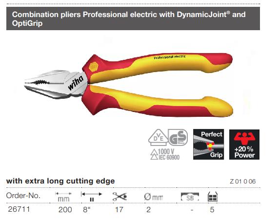 - Kìm Wiha 26711 thuộc dòng Professional electric của Wiha, tất cả kìm đều phải được kiểm tra, đạt tiêu chuẩn cách điện IEC 60900, đảm bảo người dùng làm việc an toàn trong môi trường điện lên tới 1.000 V AC