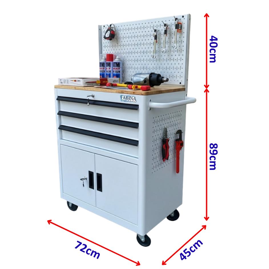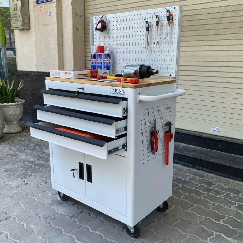 Tủ dụng cụ 3 hộc kéo 2 ngăn chứa màu trắng kèm vách lưới Fabina