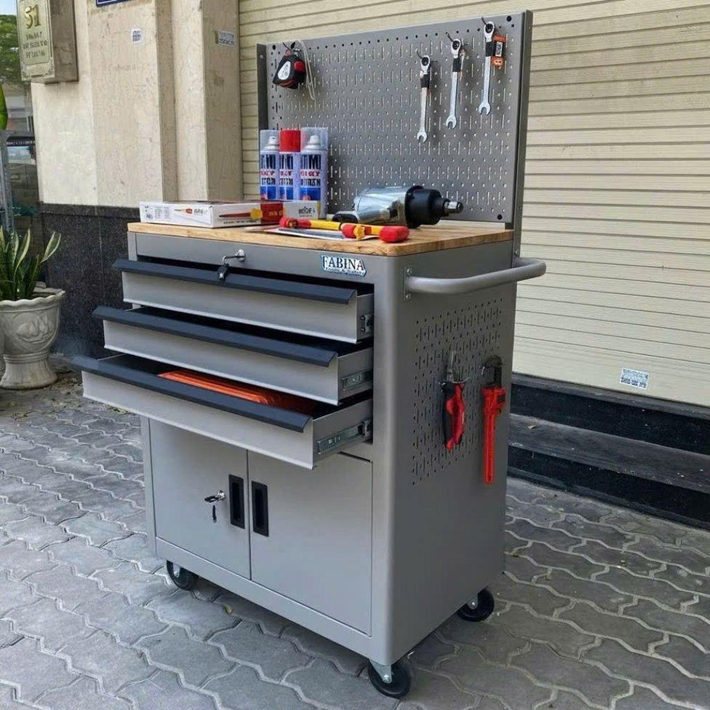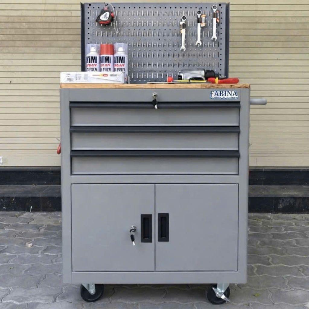 Tủ dụng cụ 3 hộc kéo 2 ngăn chứa màu xám kèm vách lưới Fabina