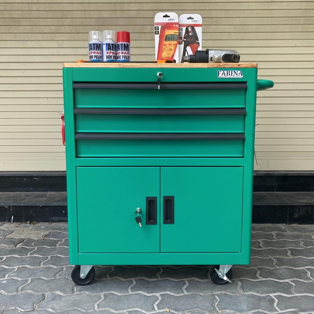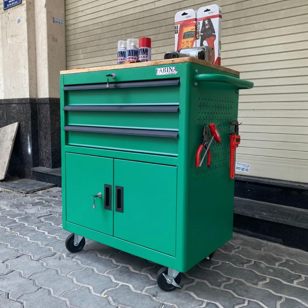 Tủ dụng cụ 3 hộc kéo 2 ngăn chứa màu xanh lá FABINA. Chứa dụng cụ, đồ nghề, văn phòng phẩm. Tủ di động, phù hợp với nhà máy, garage, cửa hàng, văn phòng. Ray trượt bi. Sơn tĩnh điện.