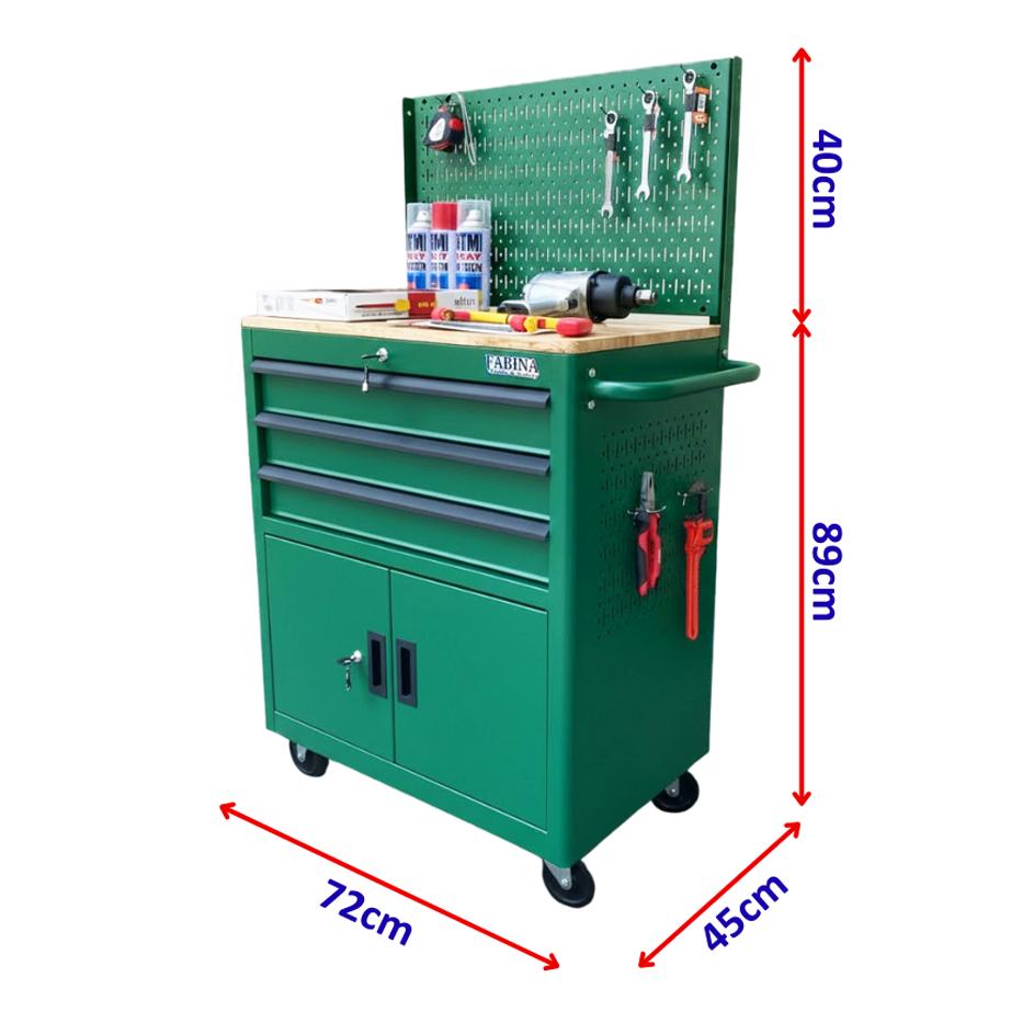 Tủ dụng cụ 3 hộc kéo 2 ngăn chứa màu xanh lá kèm vách lưới FABINA. Chứa dụng cụ, đồ nghề, văn phòng phẩm. Tủ di động, phù hợp với nhà máy, garage, cửa hàng, văn phòng. Ray trượt bi. Sơn tĩnh điện.