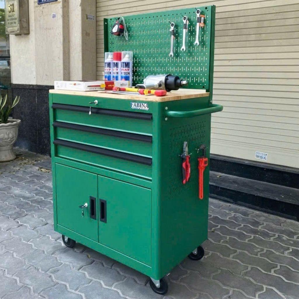 Tủ dụng cụ 3 hộc kéo 2 ngăn chứa màu xanh lá kèm vách lưới Fabina