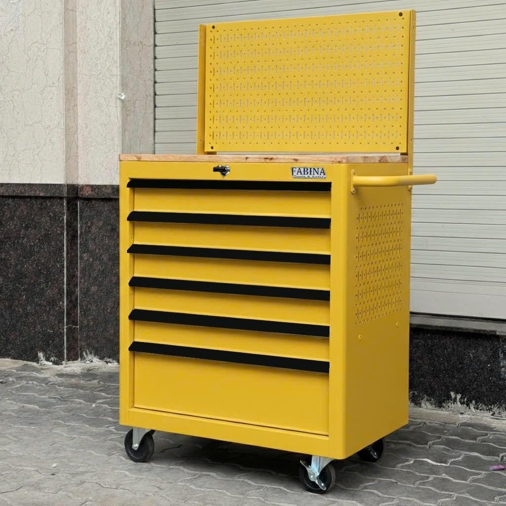 Tủ dụng cụ 6 hộc kéo màu vàng kèm vách lưới FABINA. Chứa dụng cụ, đồ nghề, văn phòng phẩm. Tủ di động, phù hợp với nhà máy, garage, cửa hàng, văn phòng. Ray trượt bi. Sơn tĩnh điện.