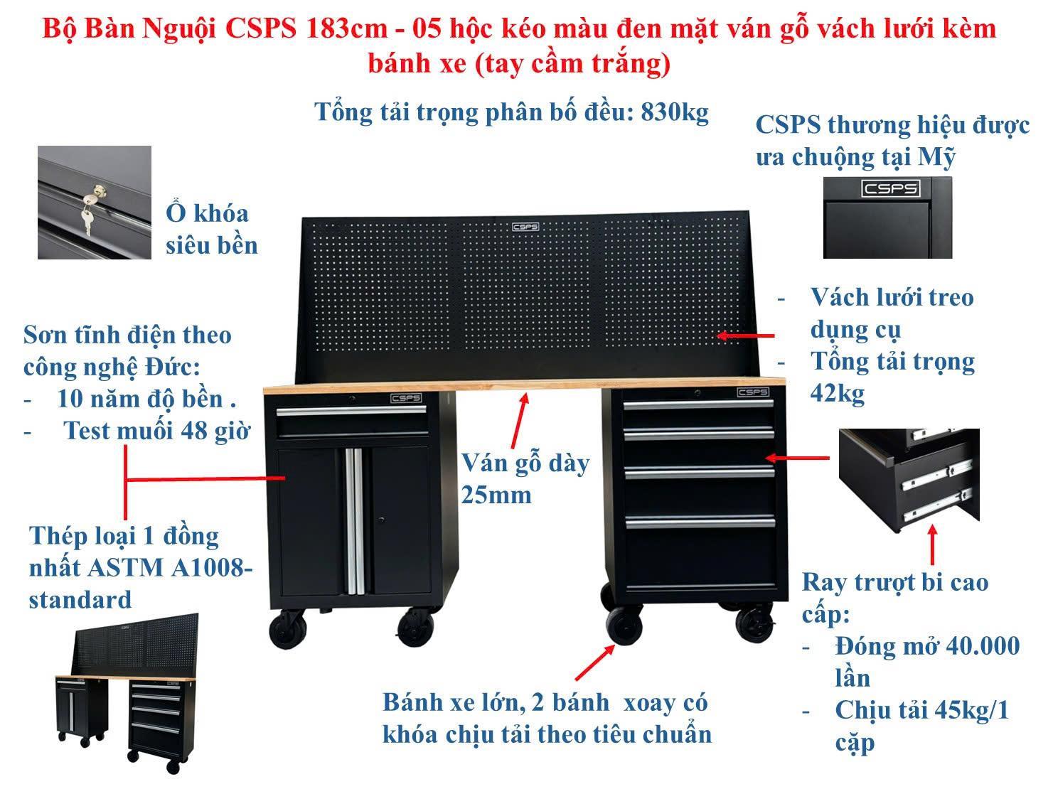 Bộ bàn nguội CSPS 183cm - 05 hộc kéo màu đen mặt ván gỗ vách lưới kèm bánh xe (tay cầm trắng)