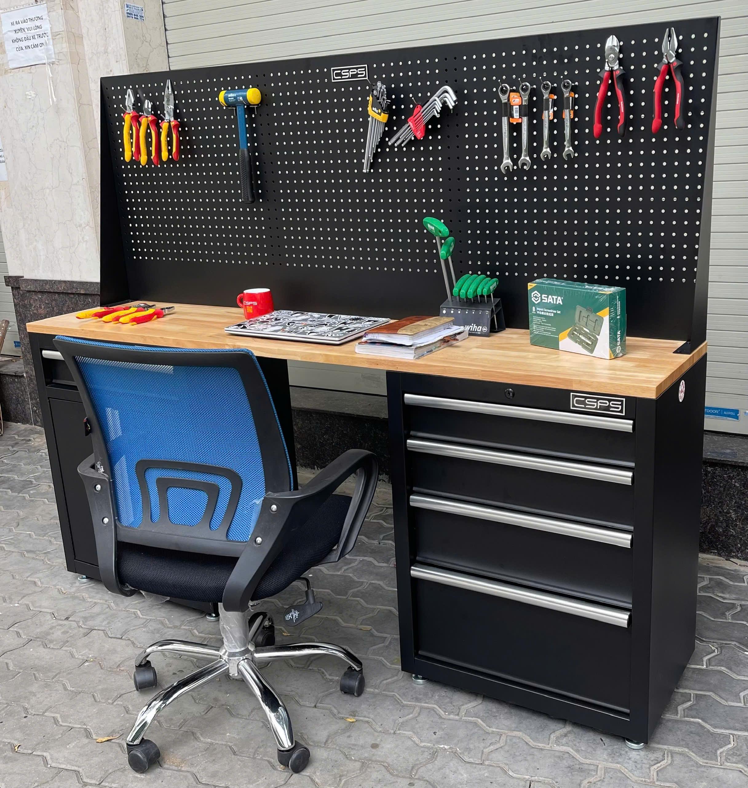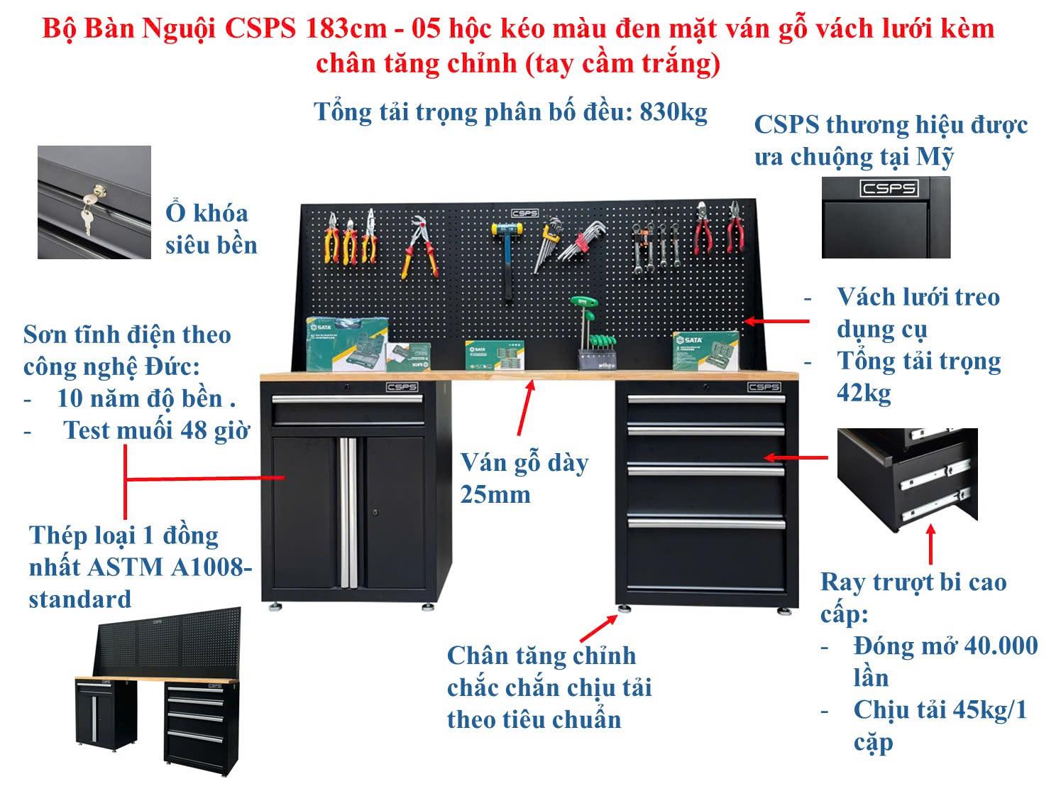 Bộ Bàn Nguội CSPS 183cm - 05 hộc kéo màu đen mặt ván gỗ vách lưới kèm chân tăng chỉnh (tay cầm trắng)