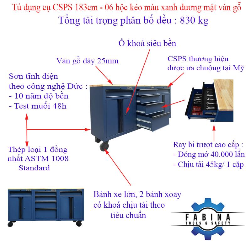 Tủ dụng cụ CSPS 183cm - 06 hộc kéo màu xanh dương mặt ván gỗ