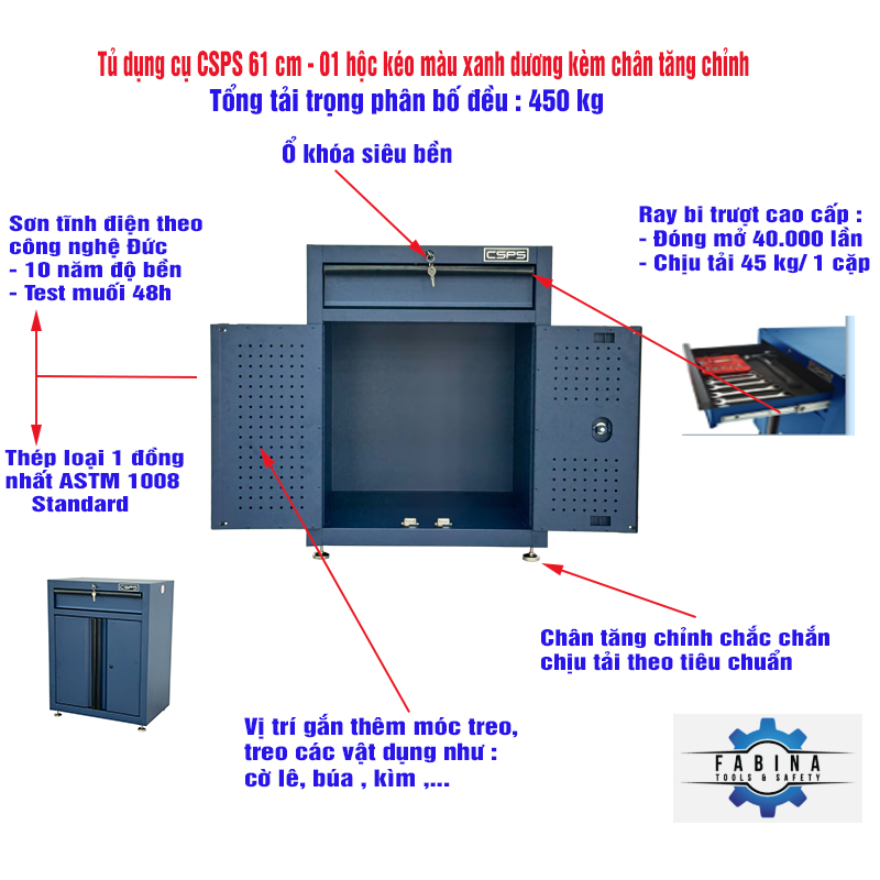 Tủ dụng cụ CSPS 61cm - 01 hộc kéo màu xanh dương kèm chân tăng chỉnh