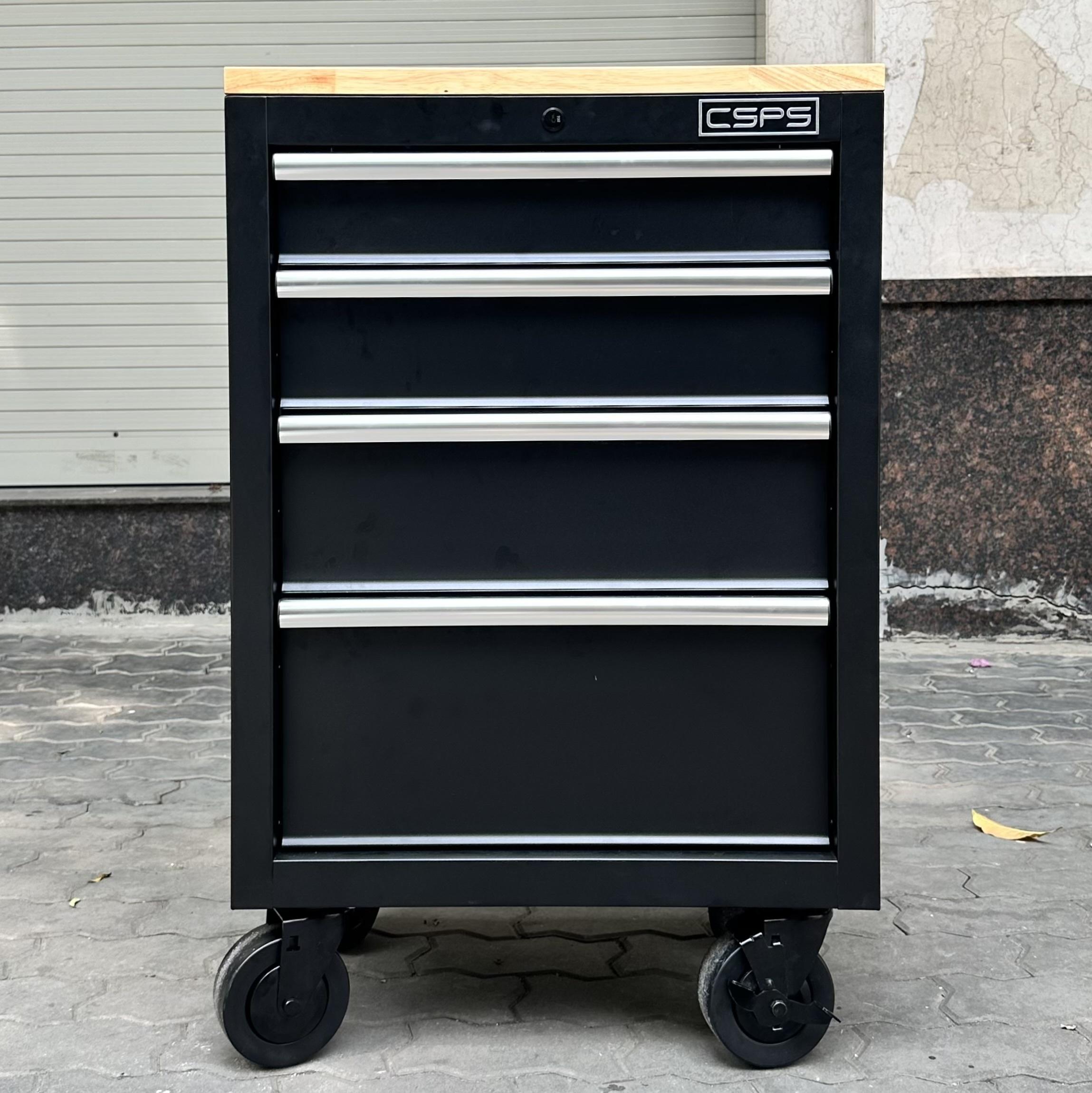 Tủ dụng cụ CSPS 61cm - 04 hộc kéo màu đen kèm bánh xe và ván gỗ (tay cầm trắng)