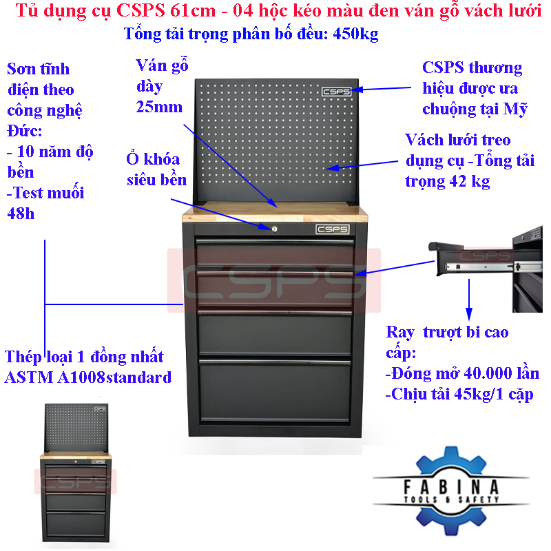 Tủ dụng cụ CSPS 61cm - 04 hộc kéo màu đen ván gỗ vách lưới