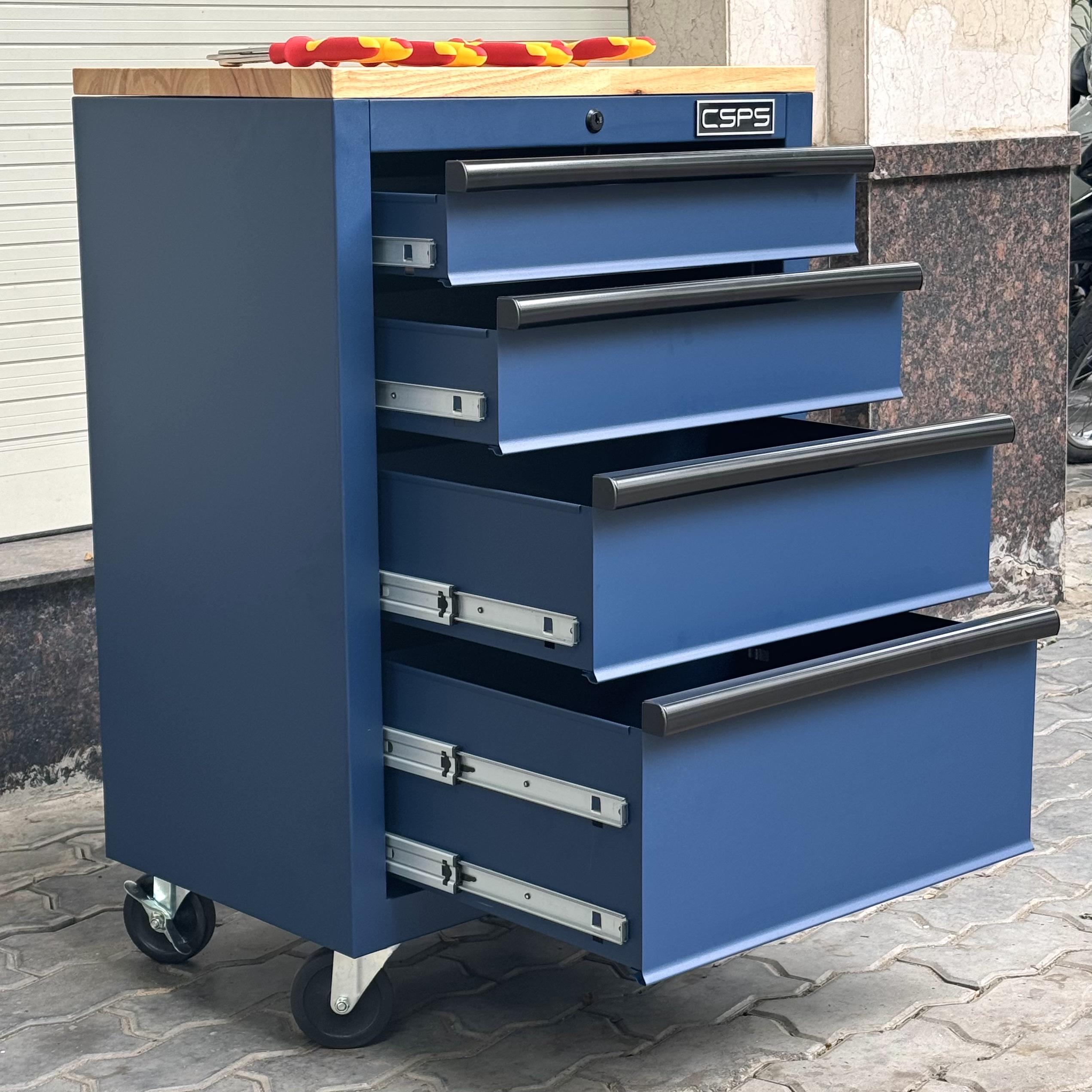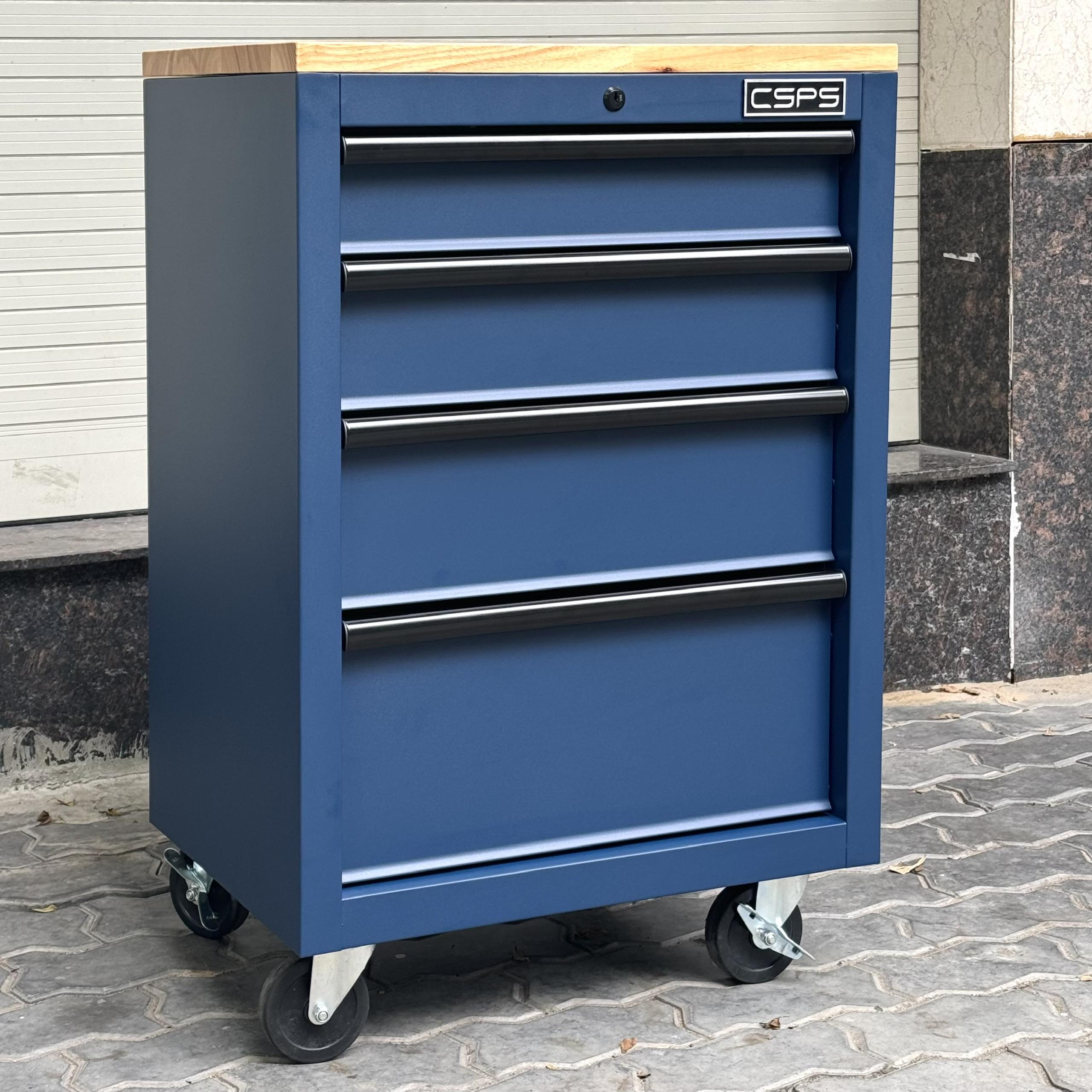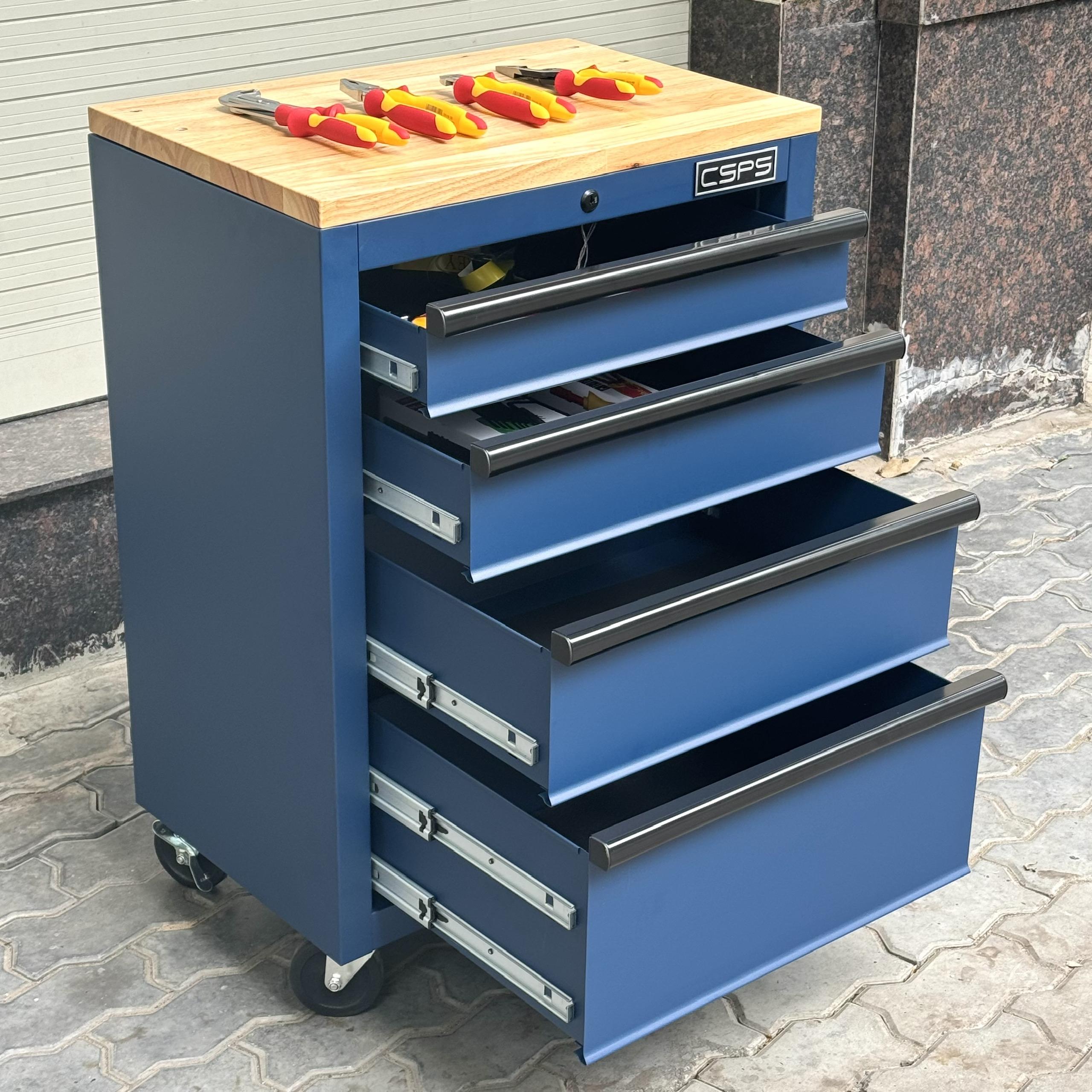 Tủ dụng cụ CSPS 61cm - 04 hộc kéo màu xanh dương mặt ván gỗ kèm bánh xe Fbn 12cm