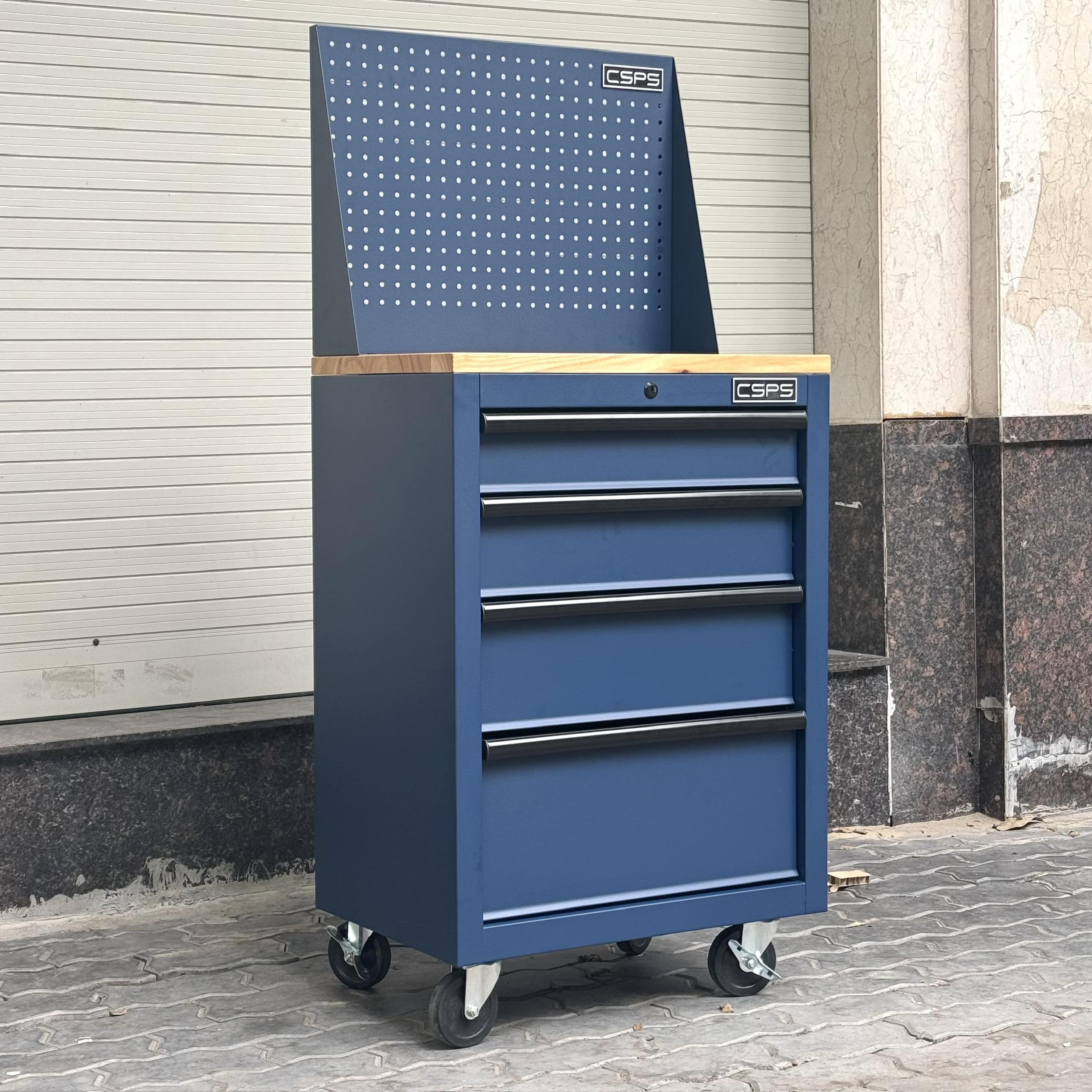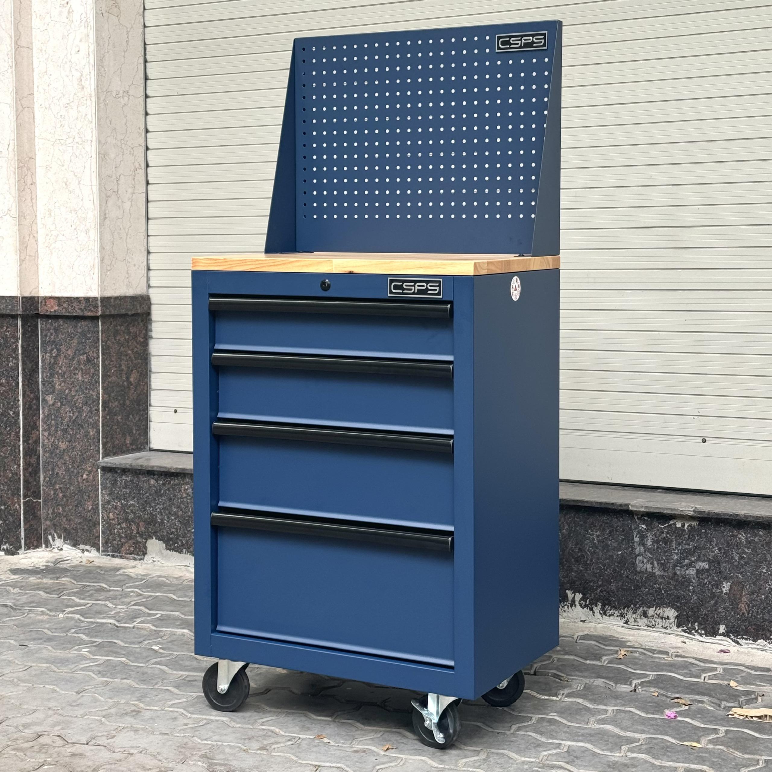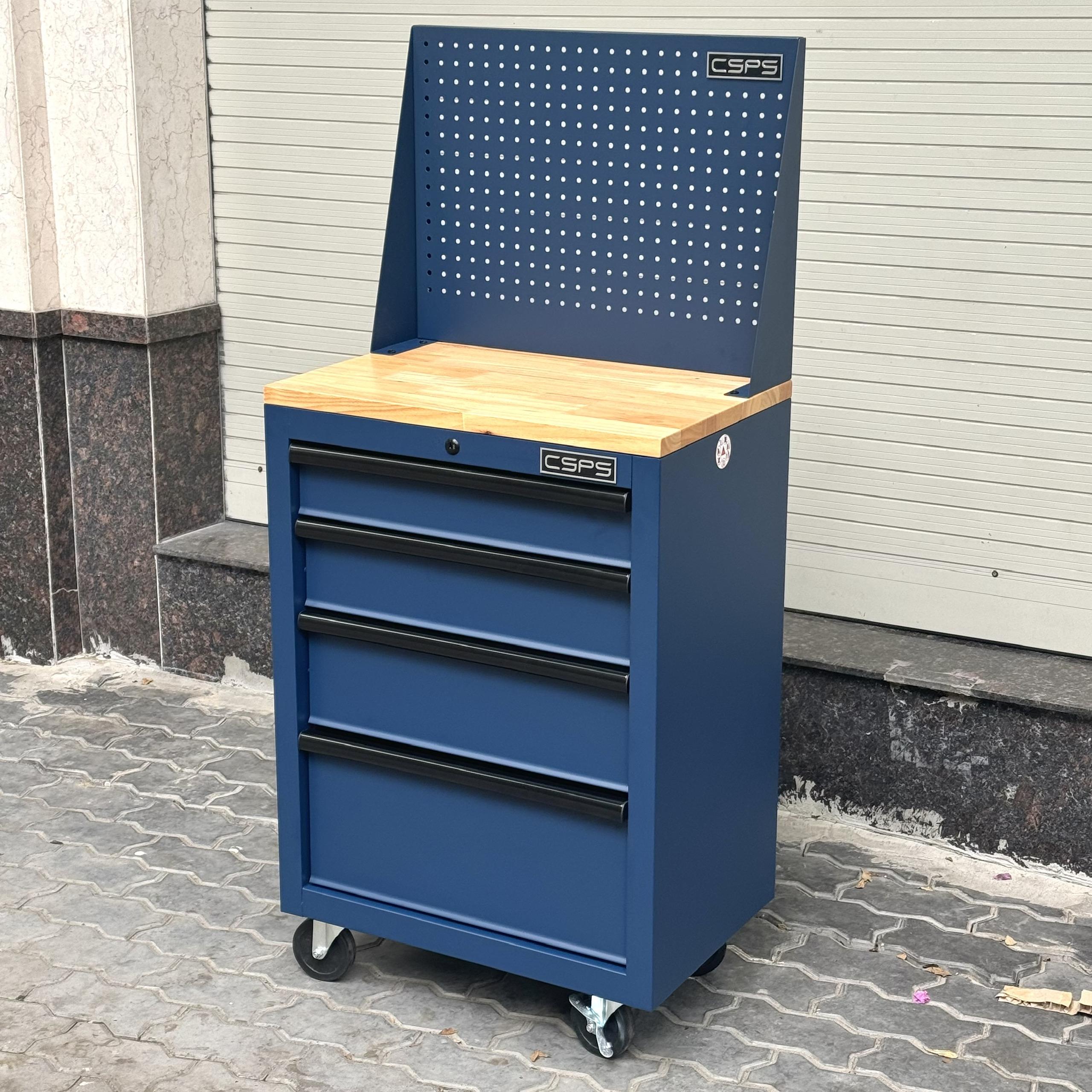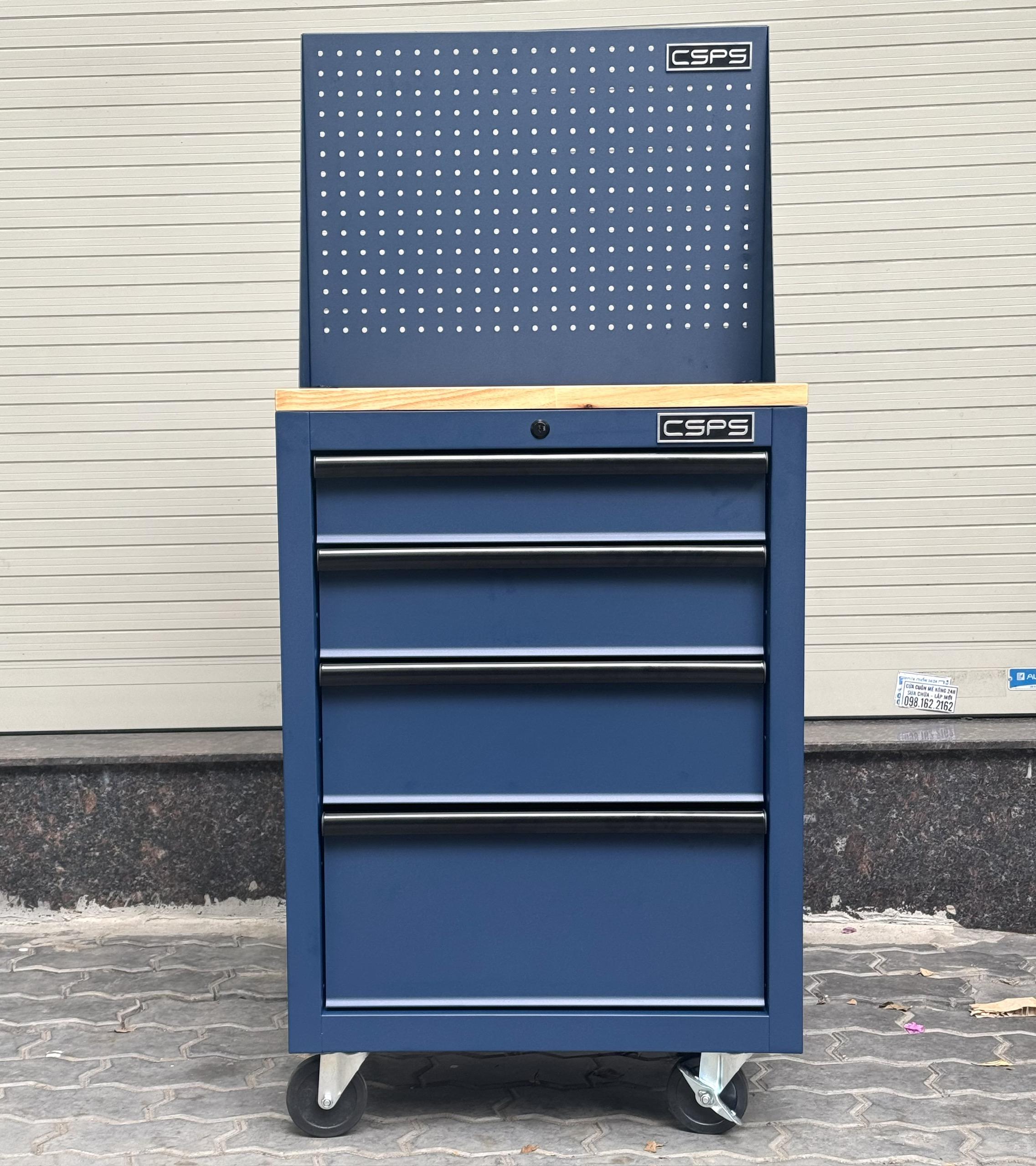 Tủ dụng cụ CSPS 61cm - 04 hộc kéo màu xanh dương mặt ván gỗ vách lưới kèm bánh xe Fbn 12cm