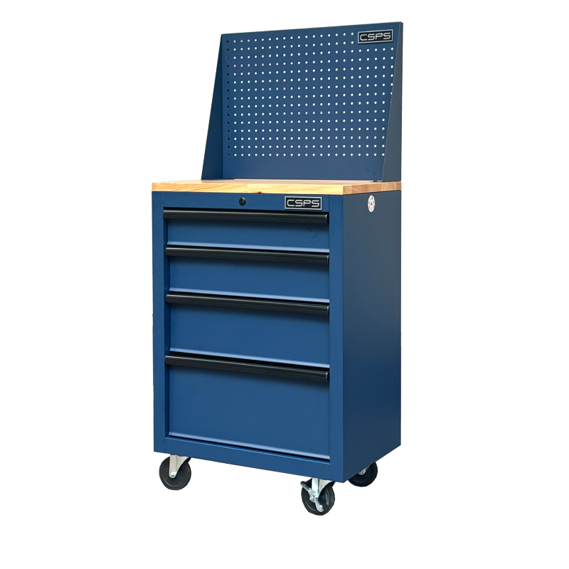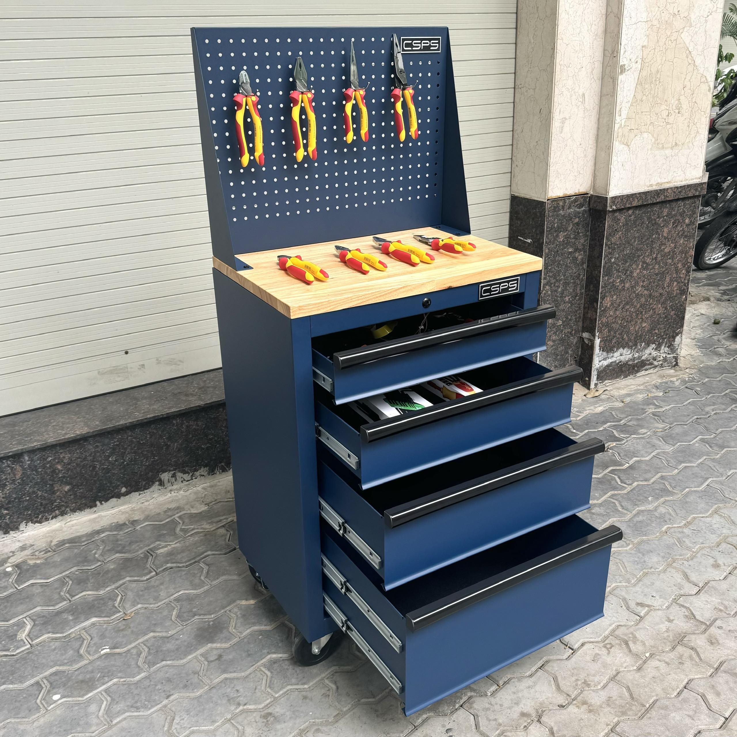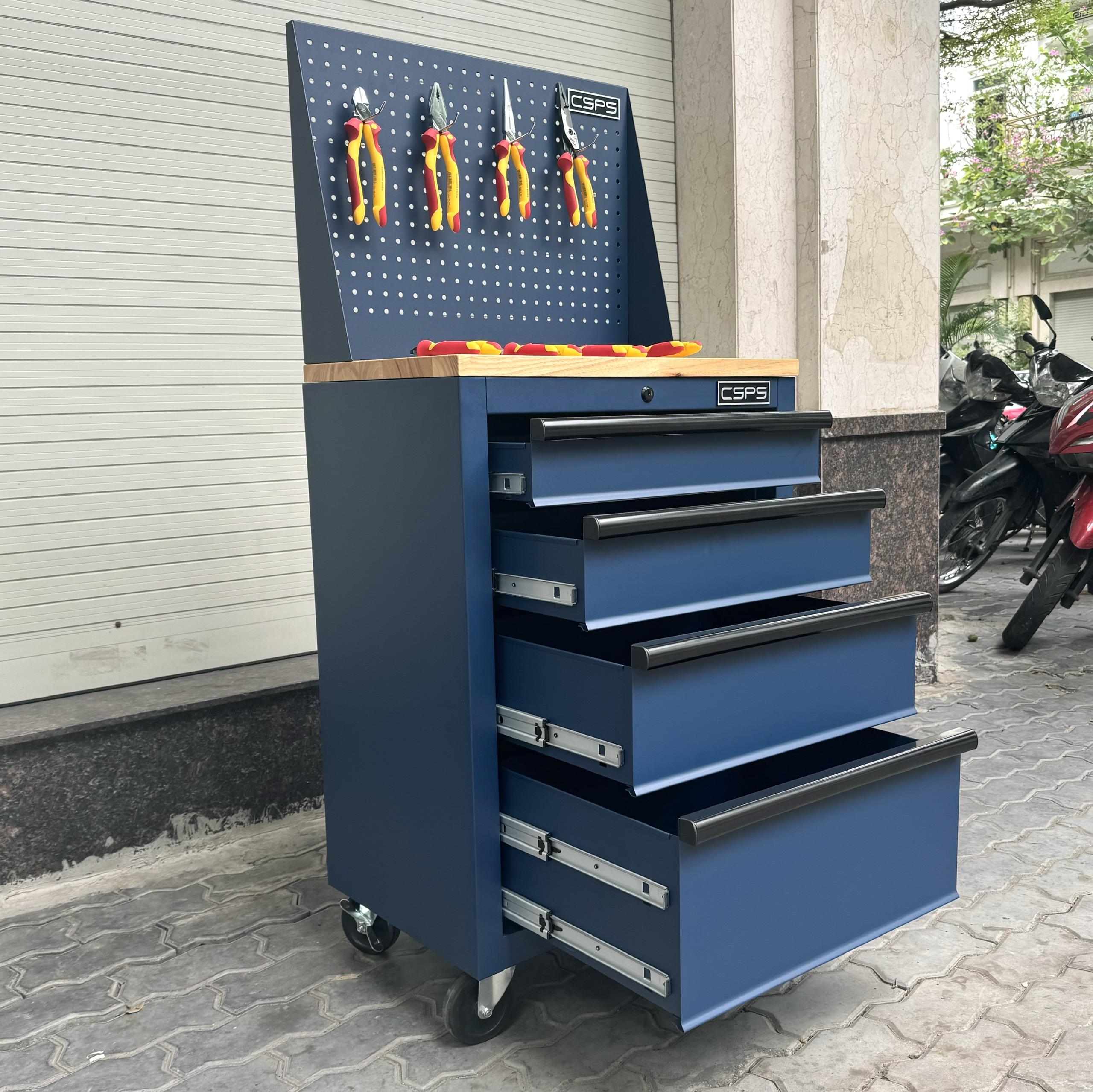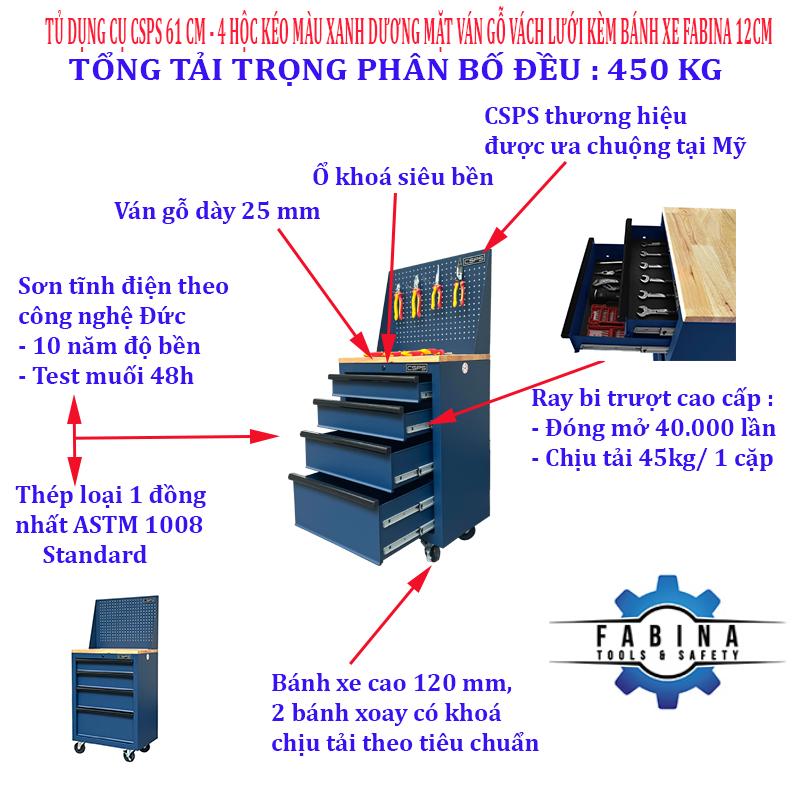 Tủ dụng cụ CSPS 61cm - 04 hộc kéo màu xanh dương mặt ván gỗ vách lưới kèm bánh xe Fbn 12cm