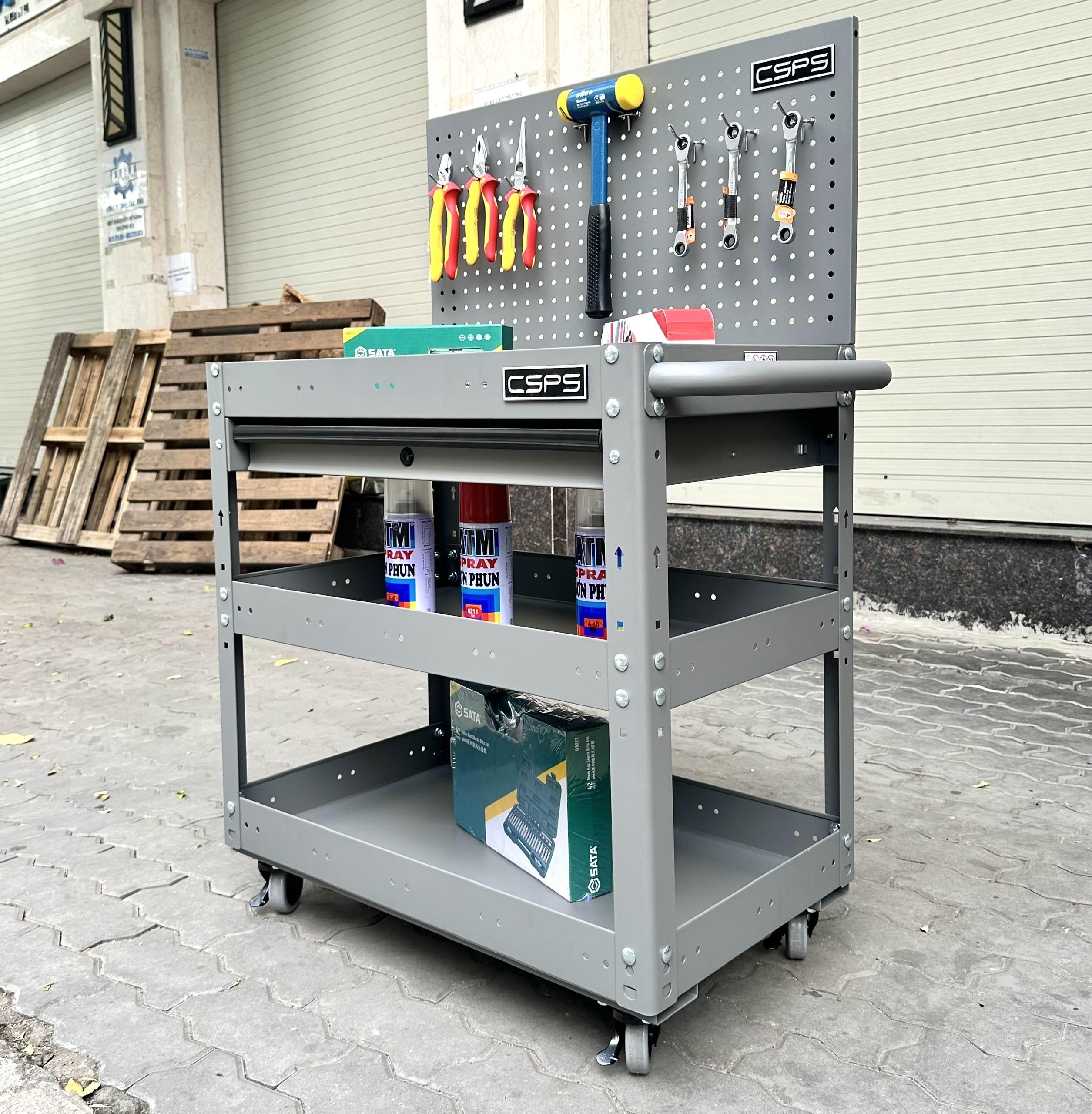 Xe đẩy CSPS 3 ngăn 71cm màu xám 01 hộc kéo kèm vách lưới