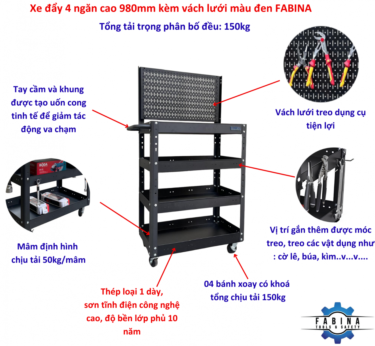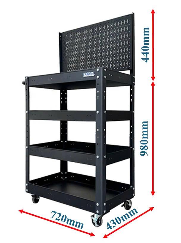 Xe đẩy 4 ngăn cao 980mm kèm vách lưới màu đen FABINA, Tiêu chuẩn Mỹ, sơn tĩnh điện, giúp bạn chứa dụng cụ và di chuyển dễ dàng trong quá trình làm việc, là một trang bị cần thiết cho nhà máy, garage, cửa hàng hay văn phòng làm việc.