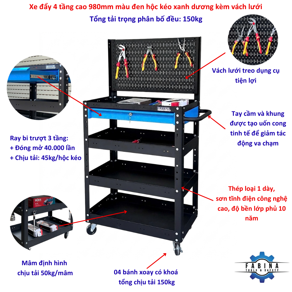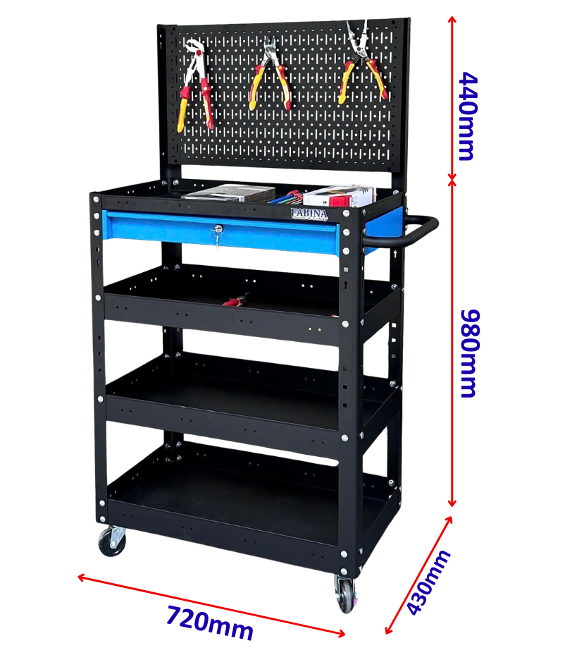 Black trolley 4 levels with Blue Drawer and Pegboard (Height 980mm)