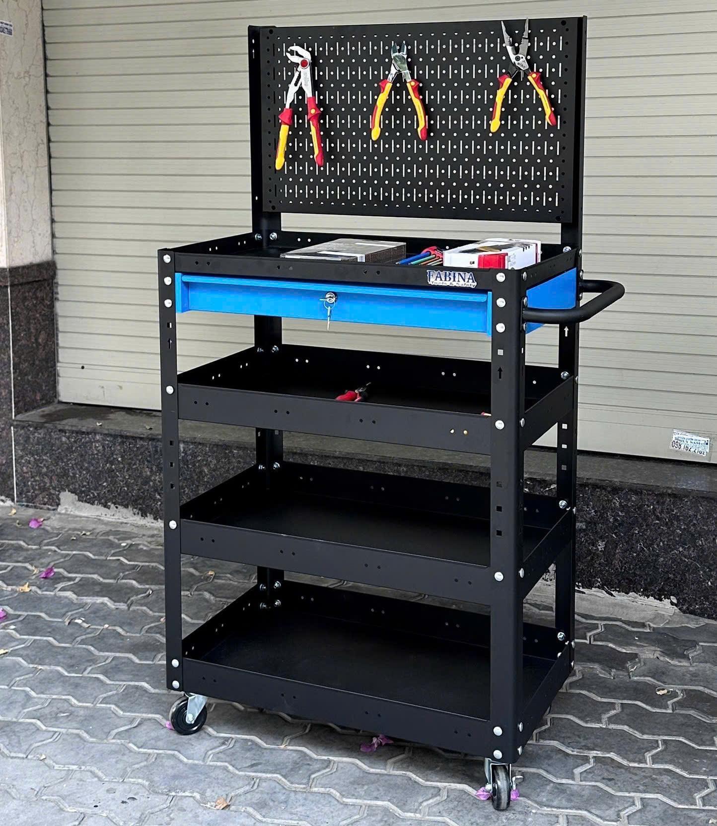 Xe đẩy 4 tầng cao 980mm màu đen hộc kéo xanh dương kèm vách lưới