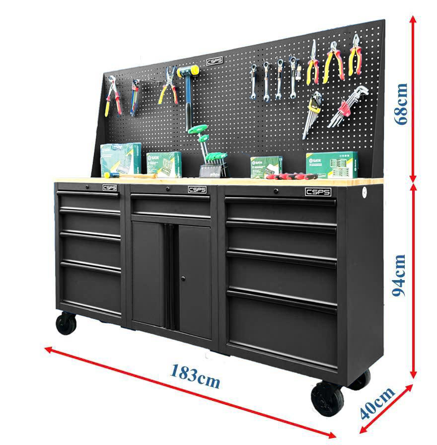 Set of 3 CSPS 183cm black tool cabinets with wooden panel and mesh wall - 09 drawers