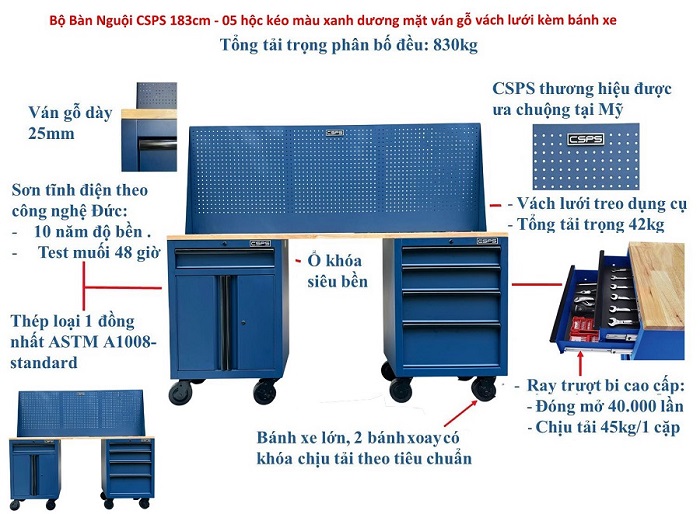 CSPS 183cm Workbench with Wooden Worktop and Pegboard and Casters– 5 Blue Drawers