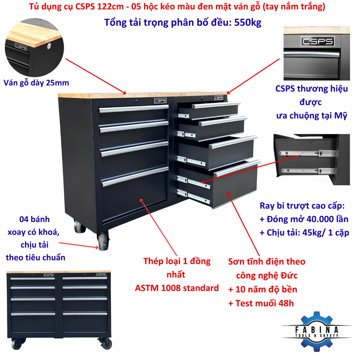 CSPS Tool Cabinet 122cm - 8 Drawers, Black with Wooden Top (White Handles)