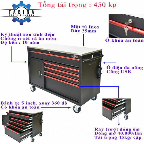 CSPS Black Tool Cabinet 132cm – 5 Drawers with Red Handles