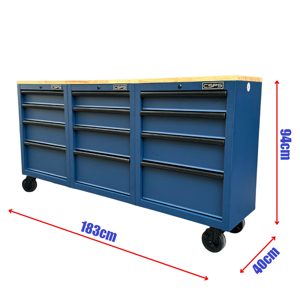 Set of 3 CSPS 183cm blue tool cabinets with wooden top - 12 drawers