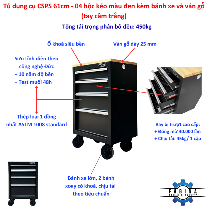 Black CSPS Tool Cabinet 61cm – 04 drawers with wooden top (white handles)