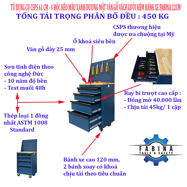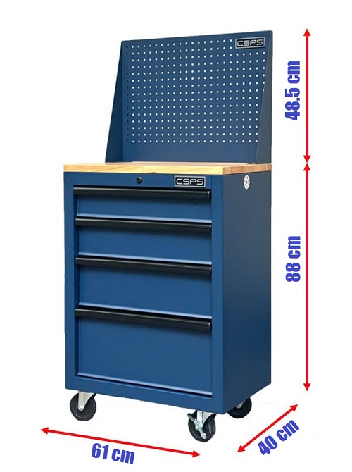 CSPS Blue Tool Cabinet 61cm with Wooden Top & Pegboard & FBN Casters 12cm – 4 Drawers