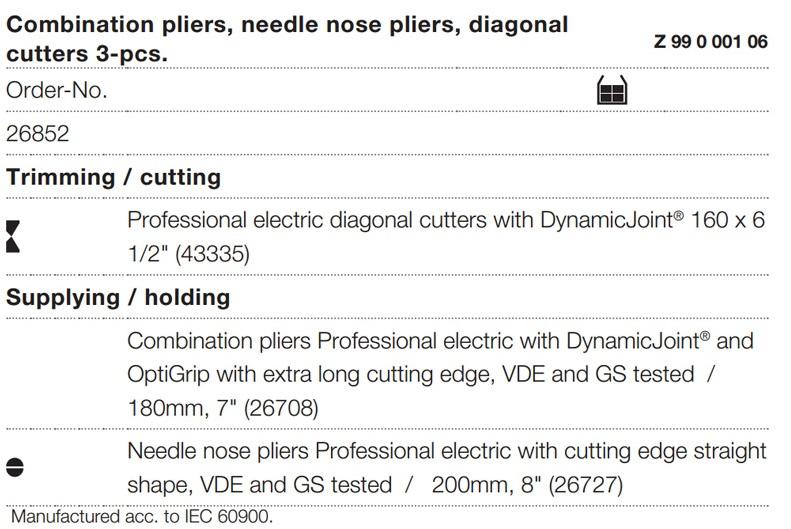 English name: Combination pliers, needle nose pliers, diagonal cutters 3-pcs.