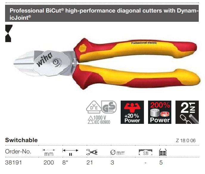 2. Kìm cắt cộng lực nút bấm Wiha 38191 Bicut 200mm cách điện 1000V