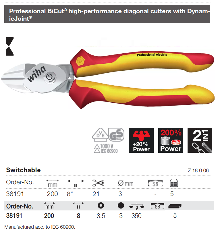 - The high-performance diagonal cutters are manufactured as per the international IEC 60900 standard and are thus approved for working on live parts up to 1,000 V AC.