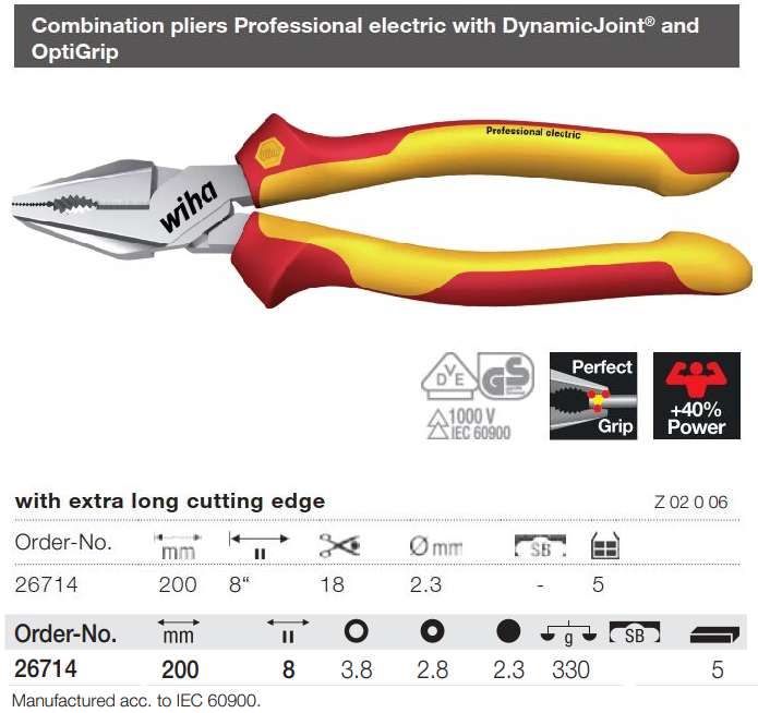 - Kìm Wiha 26714 thuộc dòng Professional electric của Wiha, tất cả kìm đều phải được kiểm tra, đạt tiêu chuẩn cách điện IEC 60900, đảm bảo người dùng làm việc an toàn trong môi trường điện lên tới 1.000 V AC