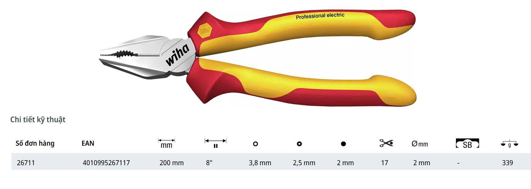 - Kìm Wiha 26711 thuộc dòng Professional electric của Wiha, tất cả kìm đều phải được kiểm tra, đạt tiêu chuẩn cách điện IEC 60900, đảm bảo người dùng làm việc an toàn trong môi trường điện lên tới 1.000 V AC