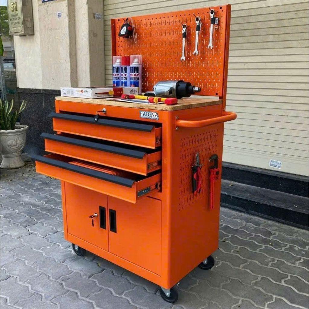 Tủ dụng cụ 3 hộc kéo 2 ngăn chứa màu cam kèm vách lưới Fabina