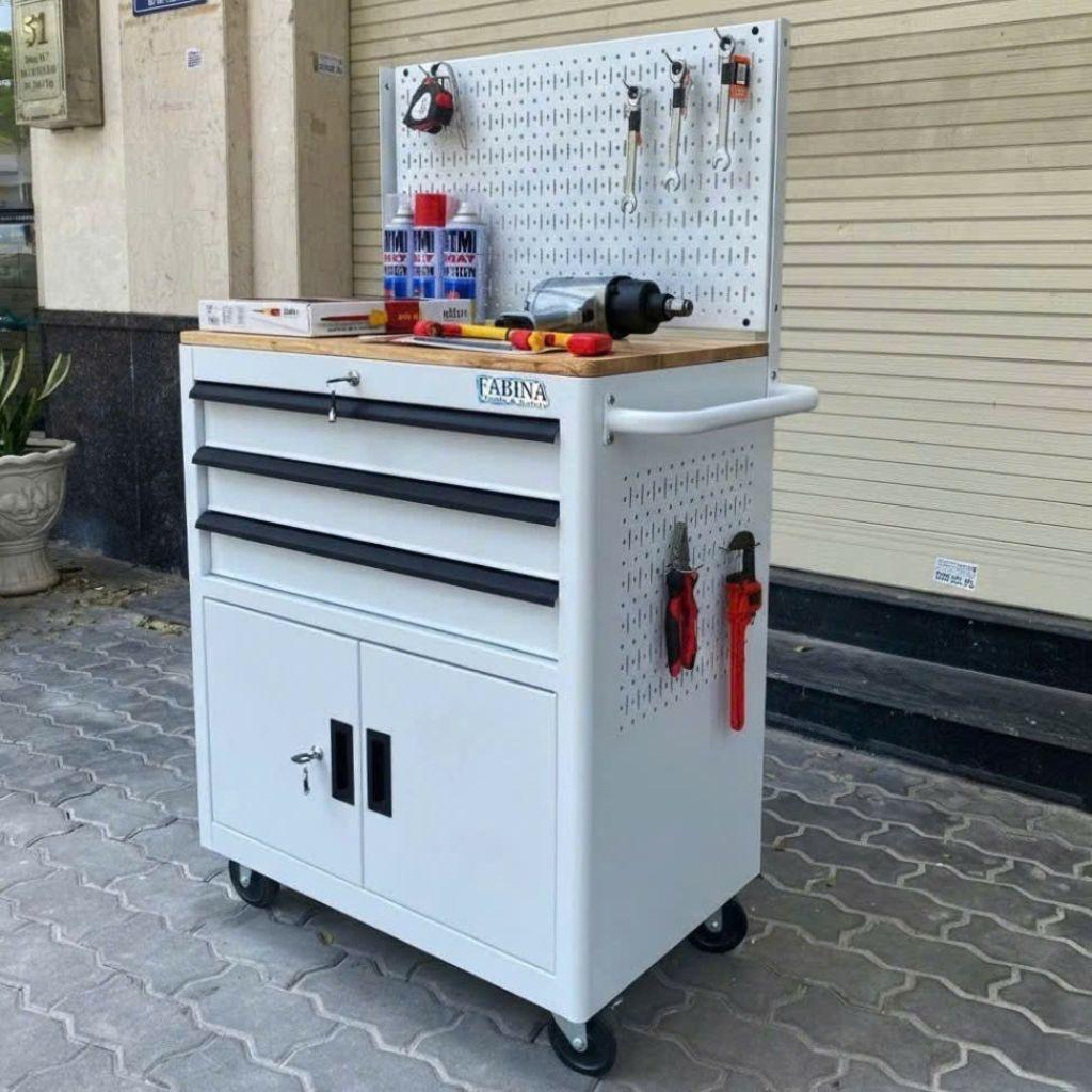 Tủ dụng cụ 3 hộc kéo 2 ngăn chứa màu trắng kèm vách lưới Fabina