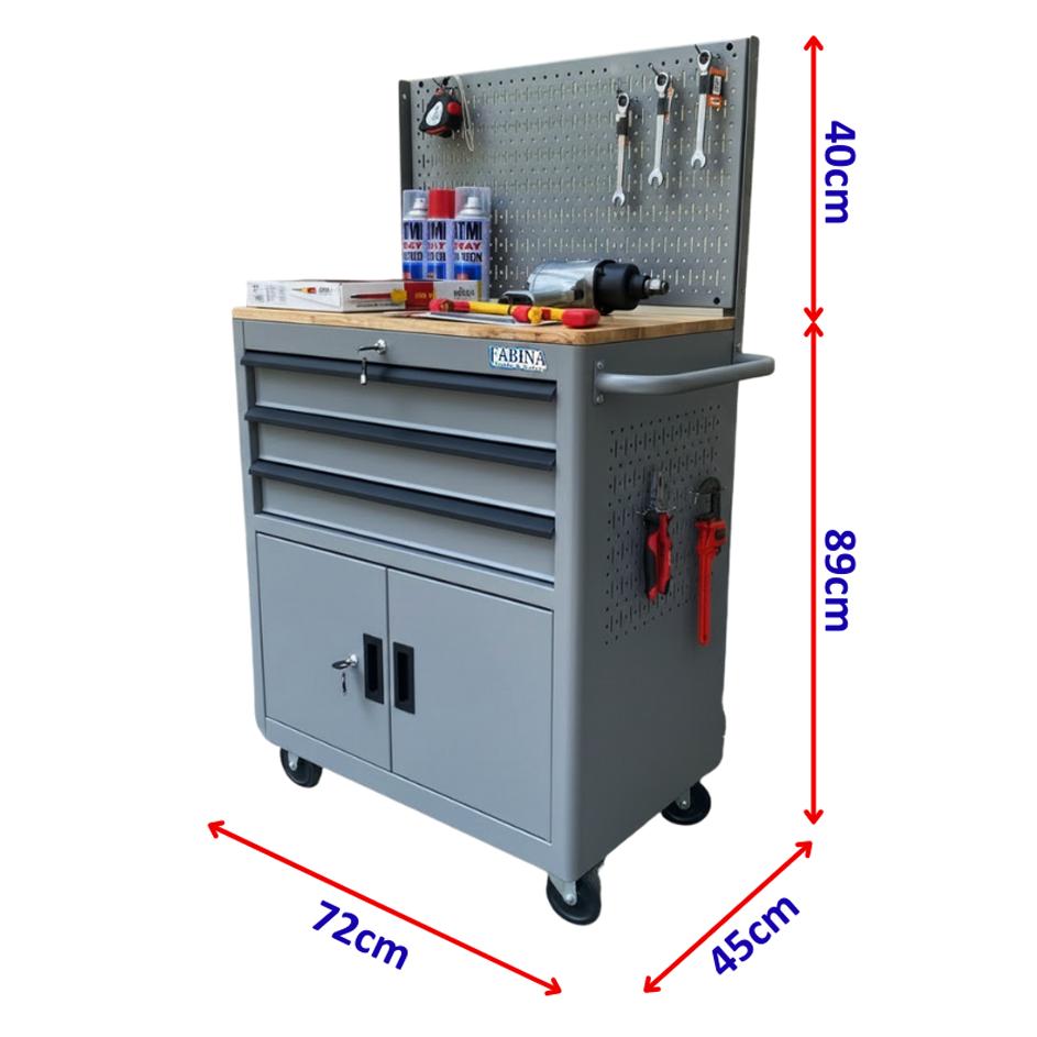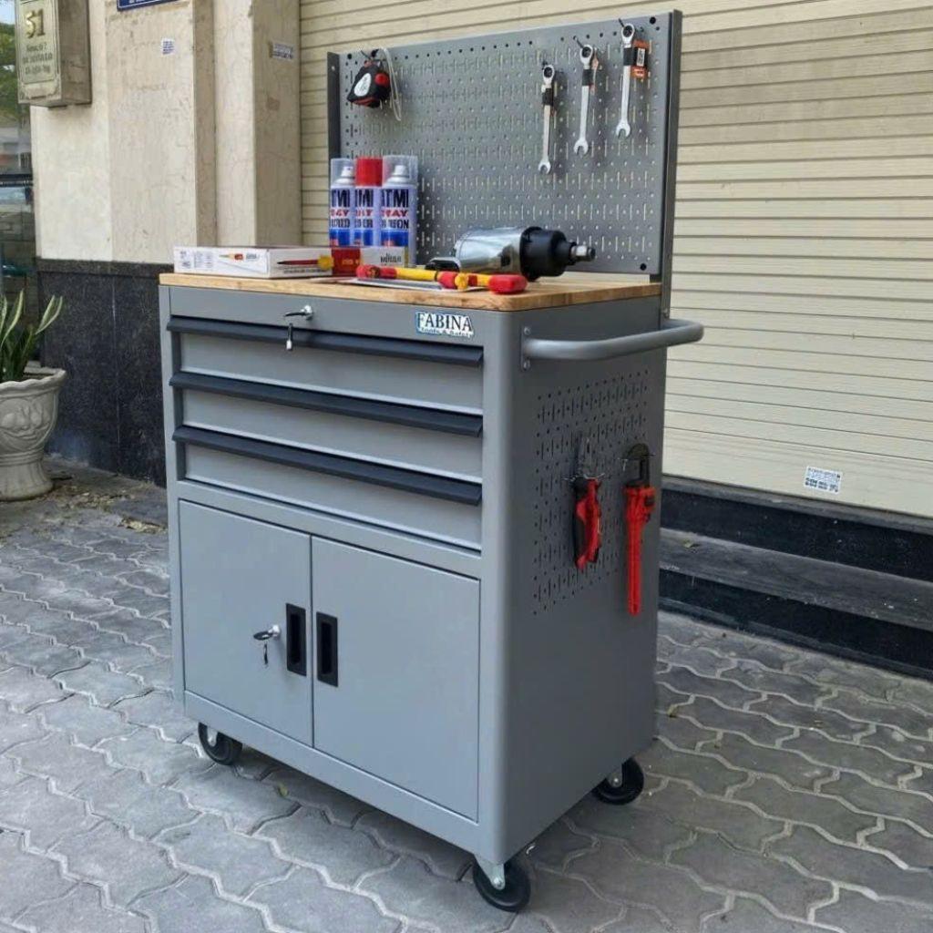 Tủ dụng cụ 3 hộc kéo 2 ngăn chứa màu xám kèm vách lưới Fabina