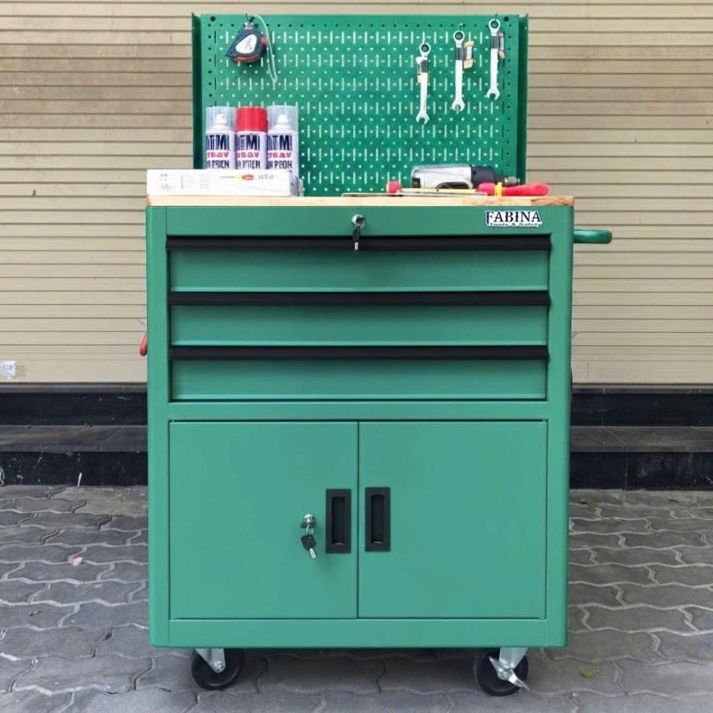 Tủ dụng cụ 3 hộc kéo 2 ngăn chứa màu xanh lá kèm vách lưới Fabina