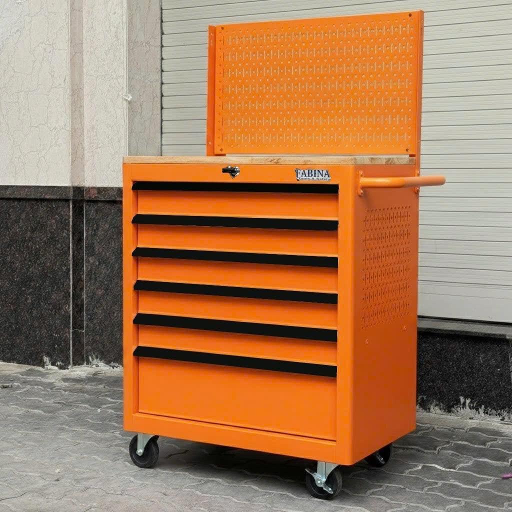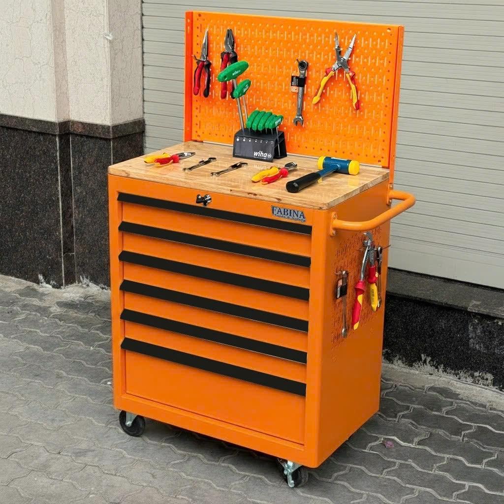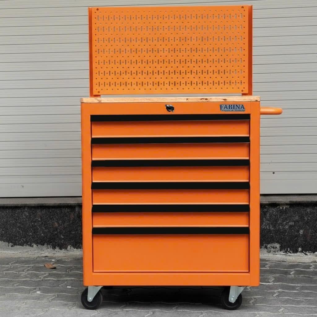 Tủ dụng cụ 6 hộc kéo màu cam kèm vách lưới FABINA. Chứa dụng cụ, đồ nghề, văn phòng phẩm. Tủ di động, phù hợp với nhà máy, garage, cửa hàng, văn phòng. Ray trượt bi. Sơn tĩnh điện.