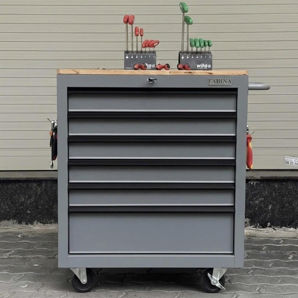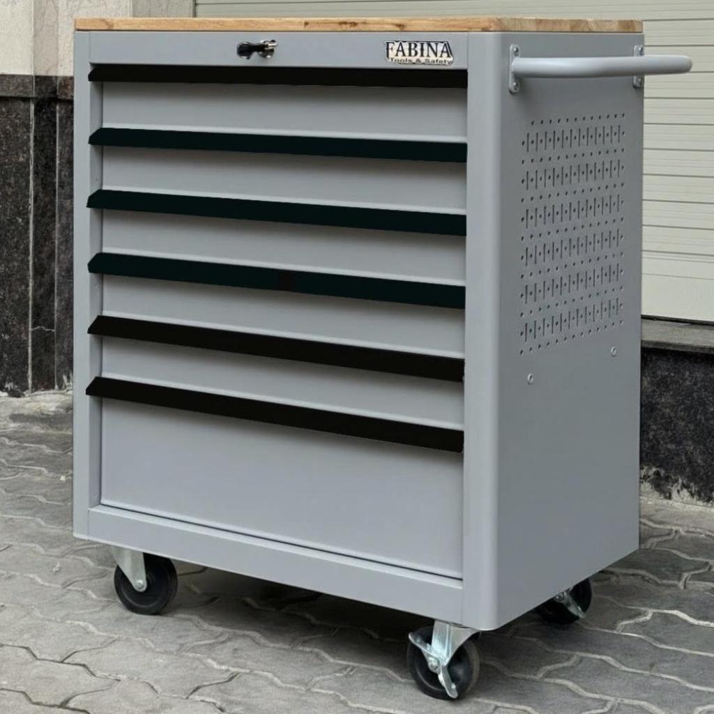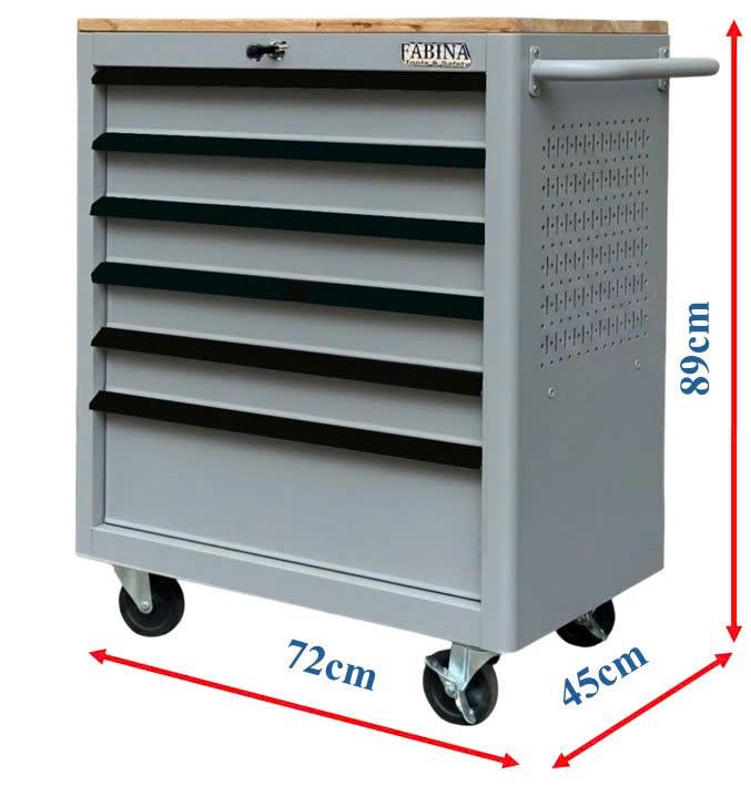 Tủ dụng cụ 6 hộc kéo màu xám Fabina. Chứa dụng cụ, đồ nghề, văn phòng phẩm. Tủ di động, phù hợp với nhà máy, garage, cửa hàng, văn phòng. Ray trượt bi. Sơn tĩnh điện.