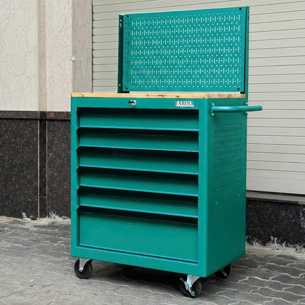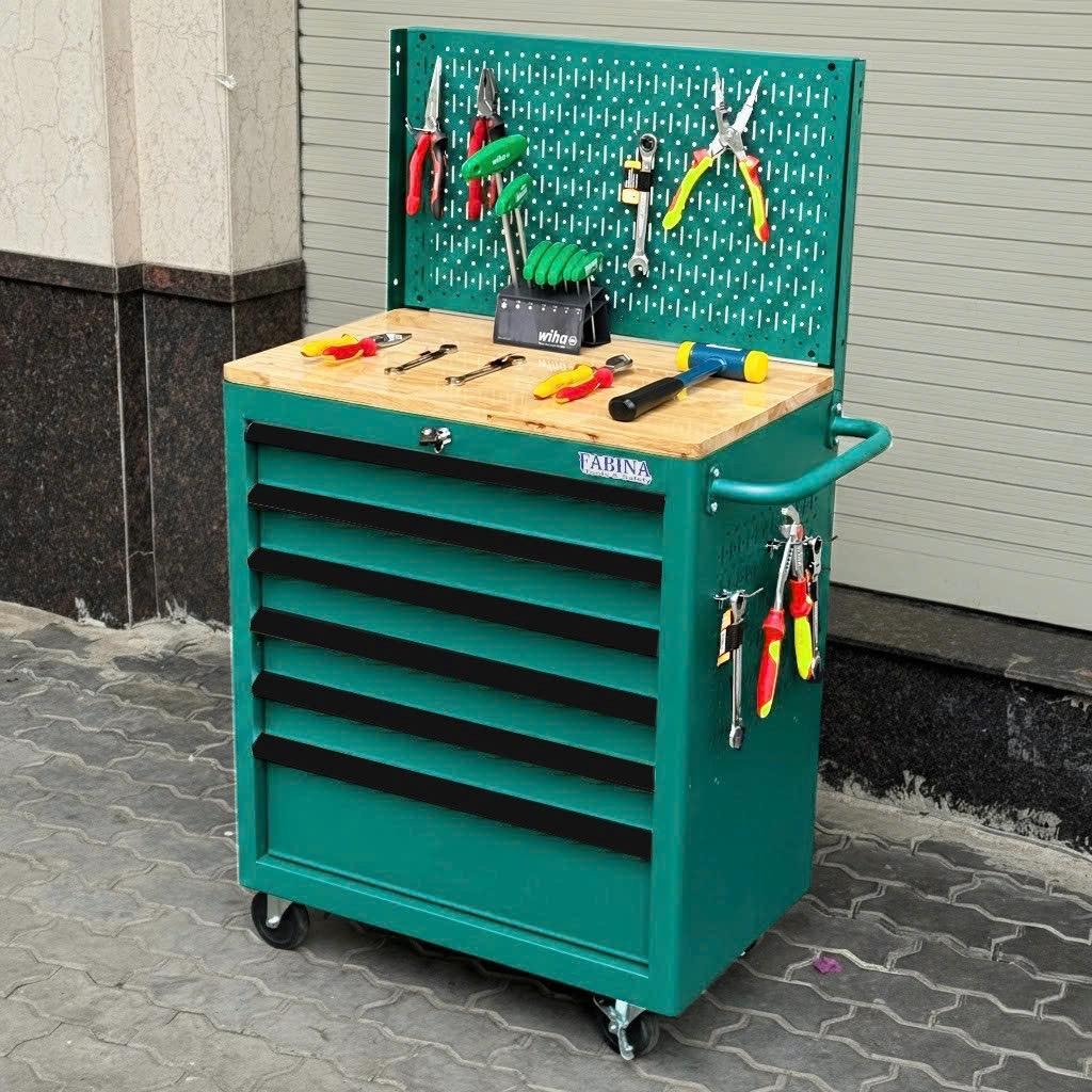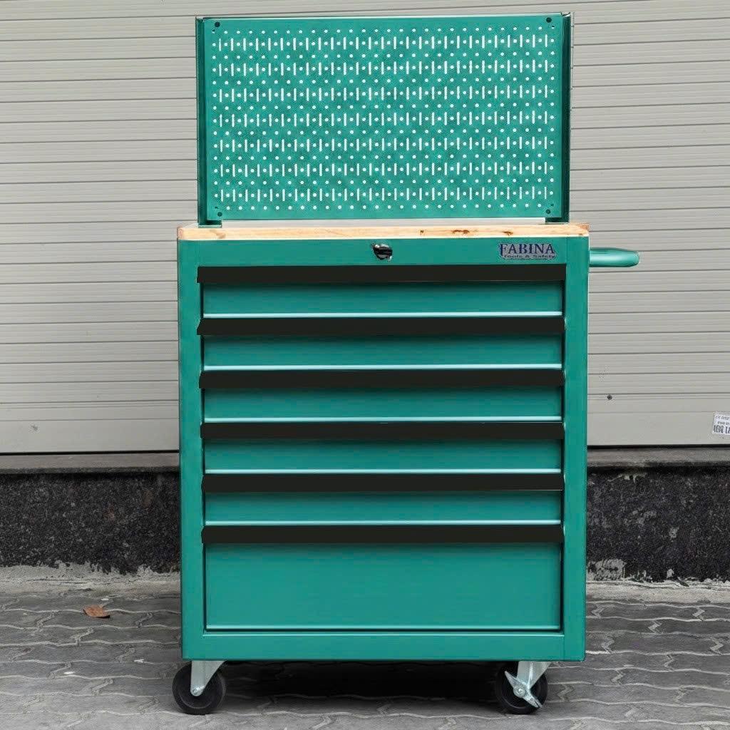 Tủ dụng cụ 6 hộc kéo màu xanh lá kèm vách lưới FABINA. Chứa dụng cụ, đồ nghề, văn phòng phẩm. Tủ di động, phù hợp với nhà máy, garage, cửa hàng, văn phòng. Ray trượt bi. Sơn tĩnh điện.