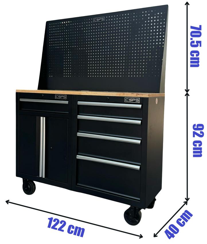 Bộ 2 Tủ dụng cụ CSPS 122cm màu đen mặt ván gỗ kèm vách lưới - 05 hộc kéo (tay cầm trắng)