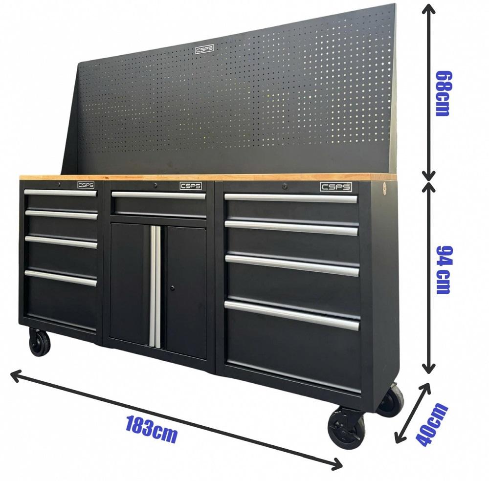 Bộ 3 Tủ dụng cụ CSPS 183cm màu đen mặt ván gỗ kèm vách lưới - 09 hộc kéo (tay cầm trắng)