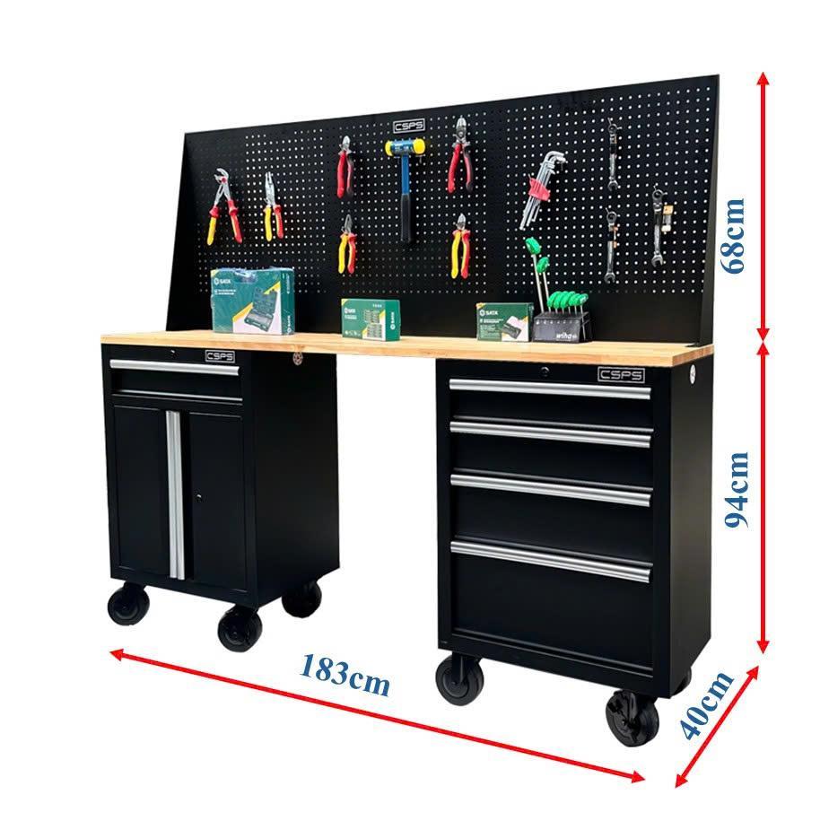 Bộ bàn nguội CSPS 183cm - 05 hộc kéo màu đen mặt ván gỗ vách lưới kèm bánh xe (tay cầm trắng)