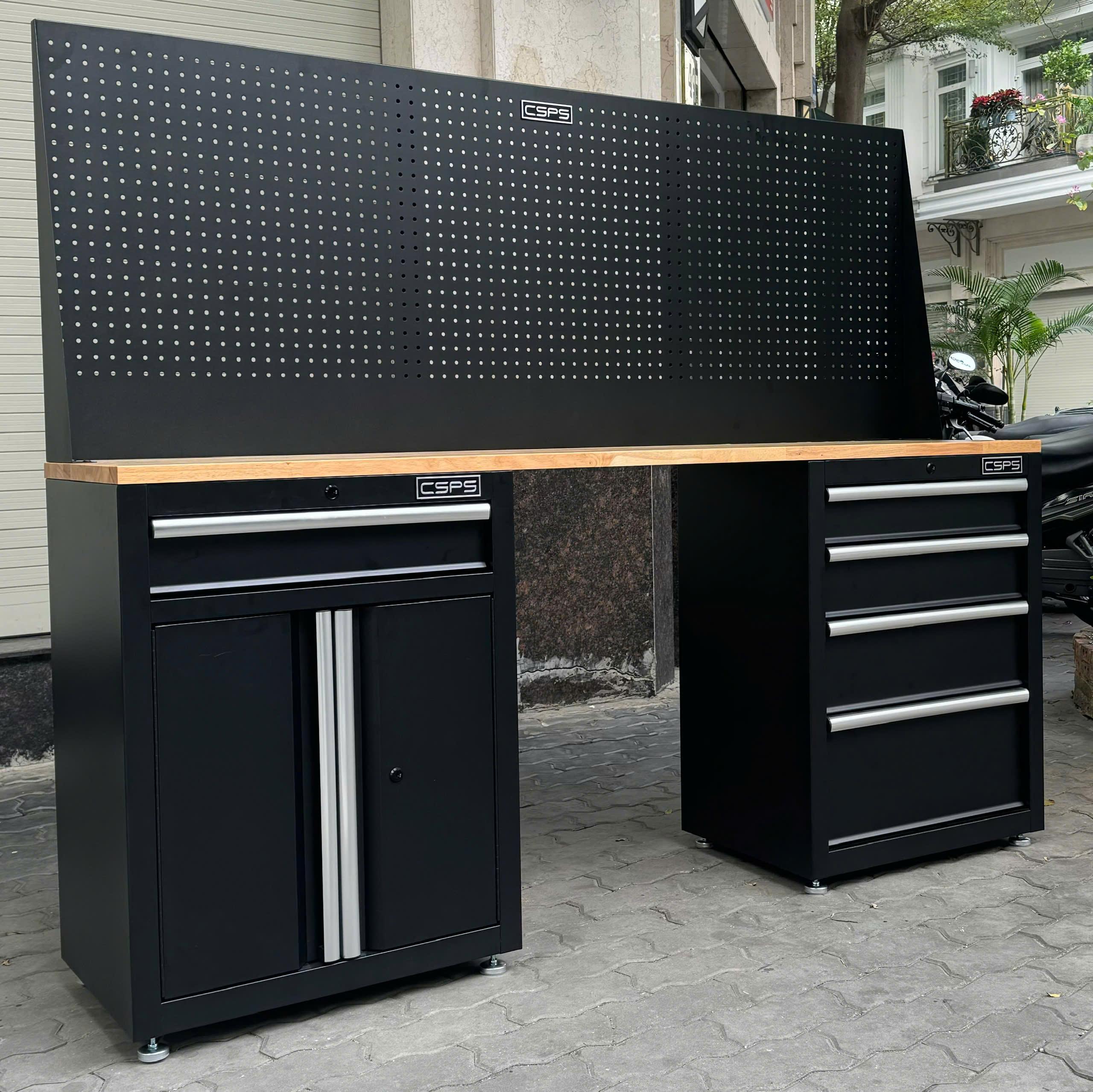 Bộ Bàn Nguội CSPS 183cm - 05 hộc kéo màu đen mặt ván gỗ vách lưới kèm chân tăng chỉnh (tay cầm trắng)