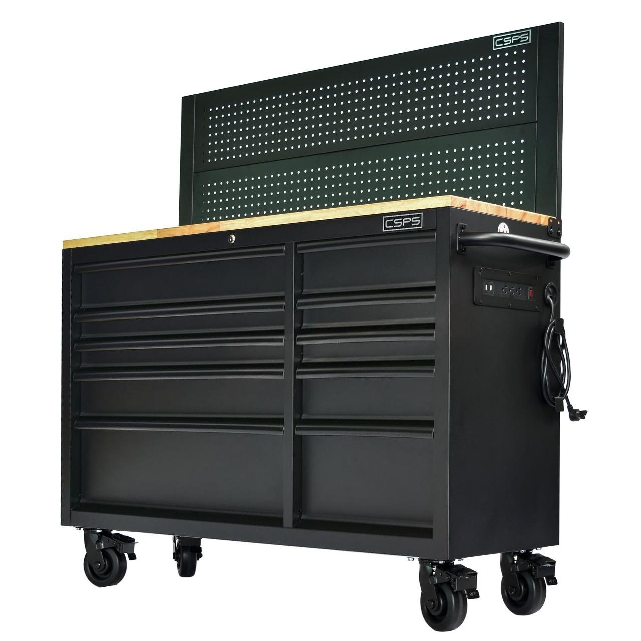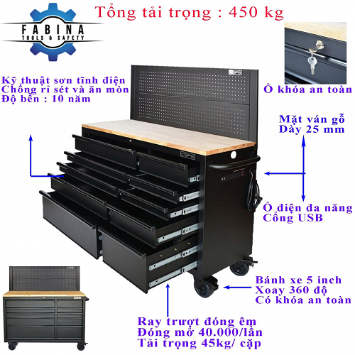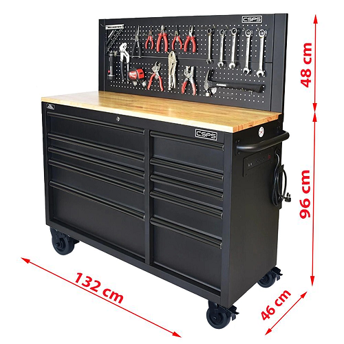 - Từ khóa: Tủ dụng cụ CSPS, Tủ đồ nghề CSPS, Tủ dụng cụ tiêu chuẩn Mỹ, Tủ CSPS, Tủ dụng cụ 10 ngăn mặt ván gỗ có vách lưới nâng hạ có ổ điện đa năng, có cổng USB.