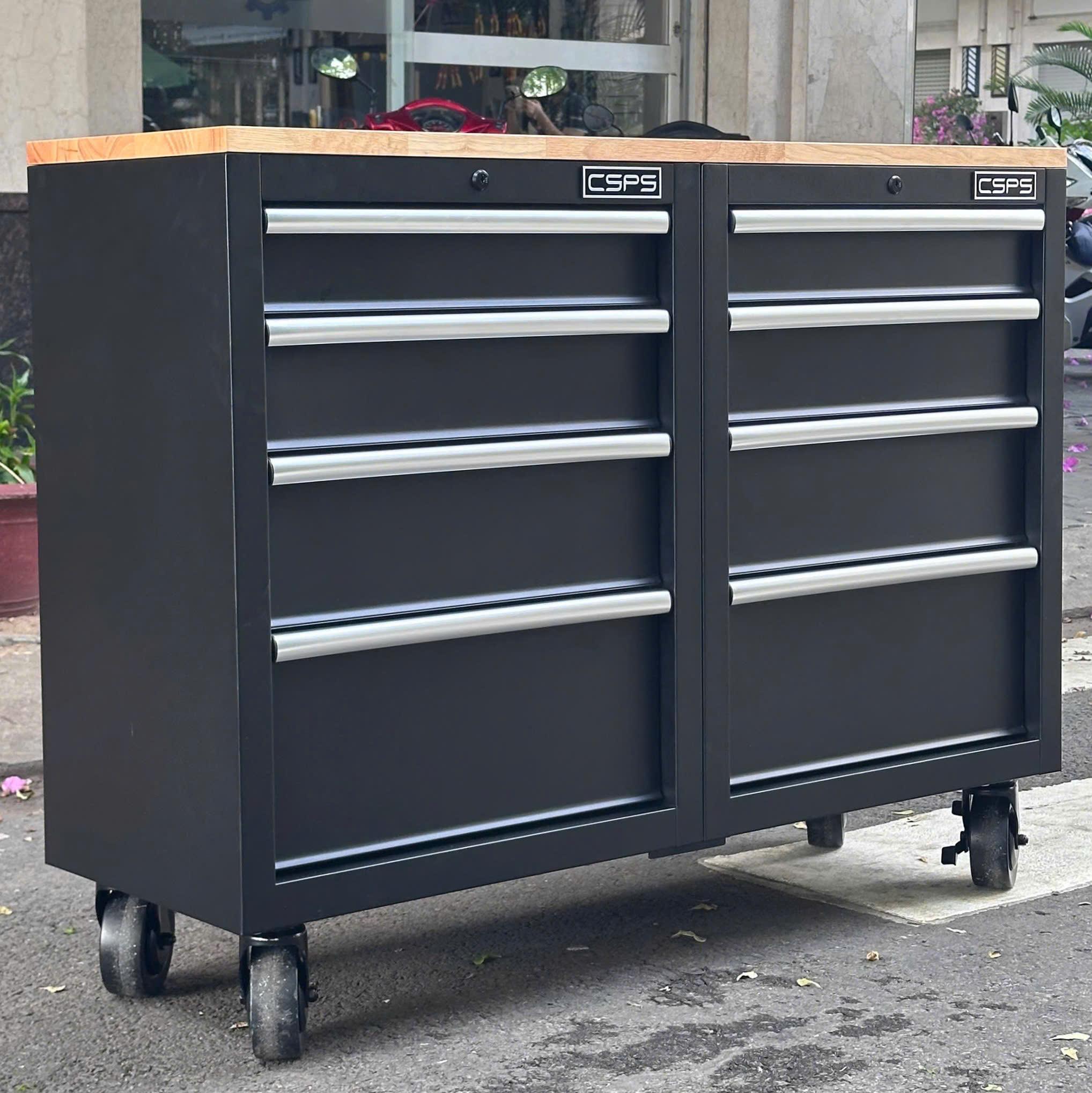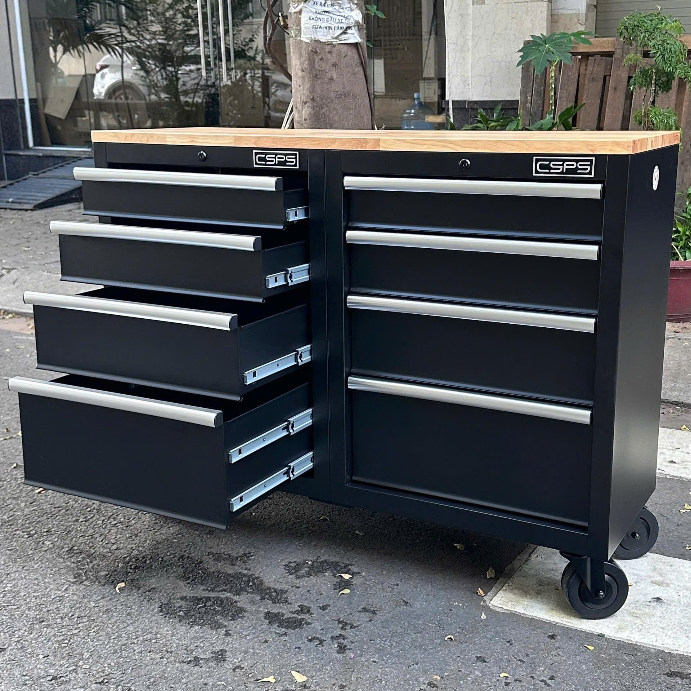 Tủ dụng cụ CSPS 122cm - 08 hộc kéo màu đen tay cầm trắng mặt ván gỗ
