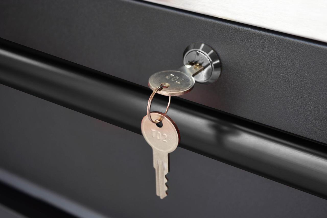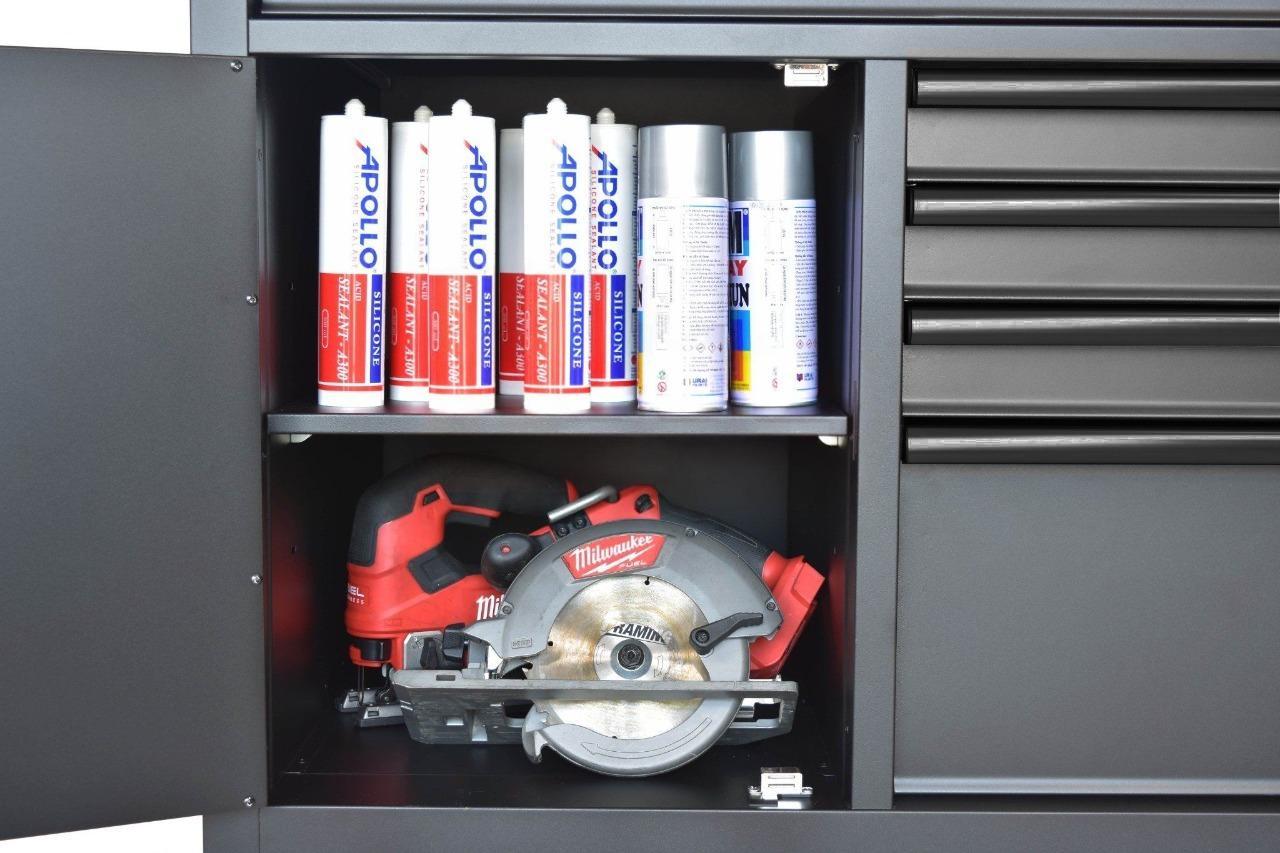 - Tiết kiệm không gian làm việc thông qua việc kết hợp bàn nguội vào tủ dụng cụ. / Save working space by combining working table with tool cabinet.
